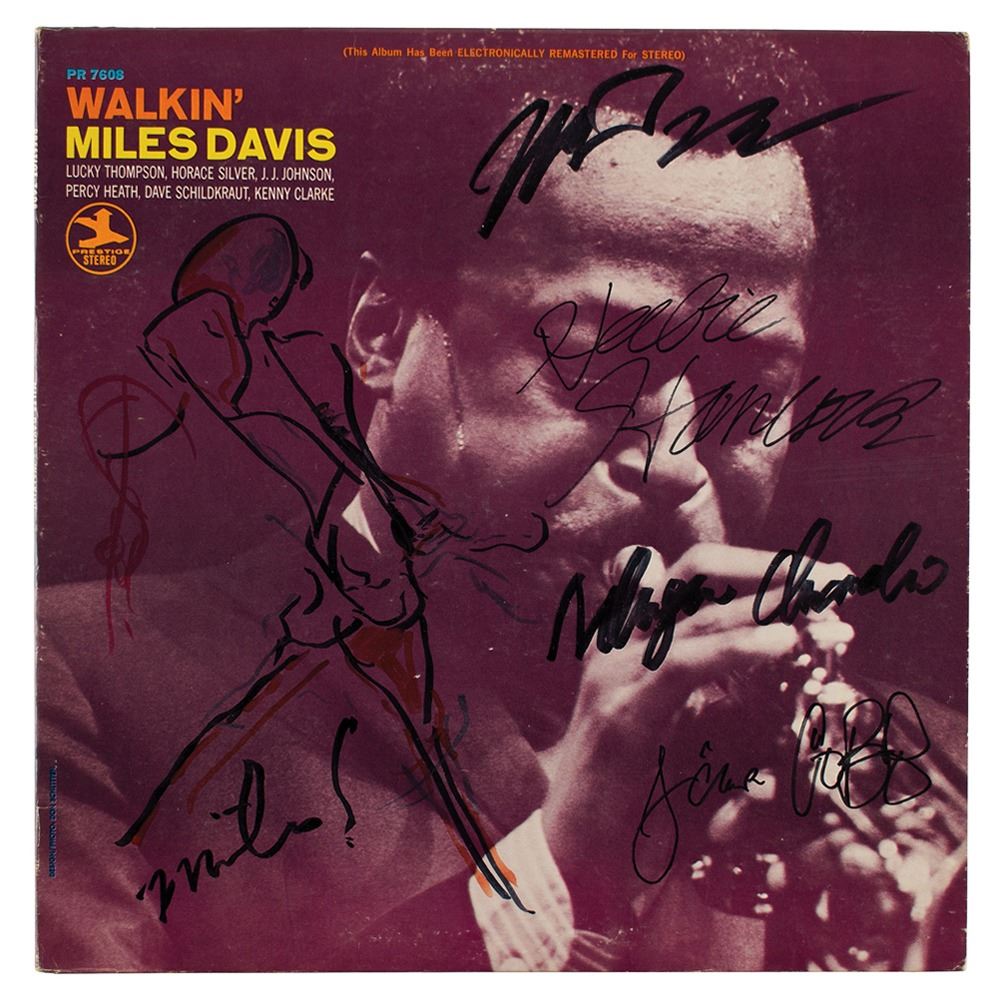 Walkin' compilation album by Miles Davis (Prestige – PRST 7608), signed on the front cover in black felt tip, "Miles!," who adds a large sketch of a trumpet player in multicolored felt tip. The album is also signed by Herbie Hancock, Jimmy Cobb, Ndugu Chancler, and Michael Henderson. In fine condition. The record is included.