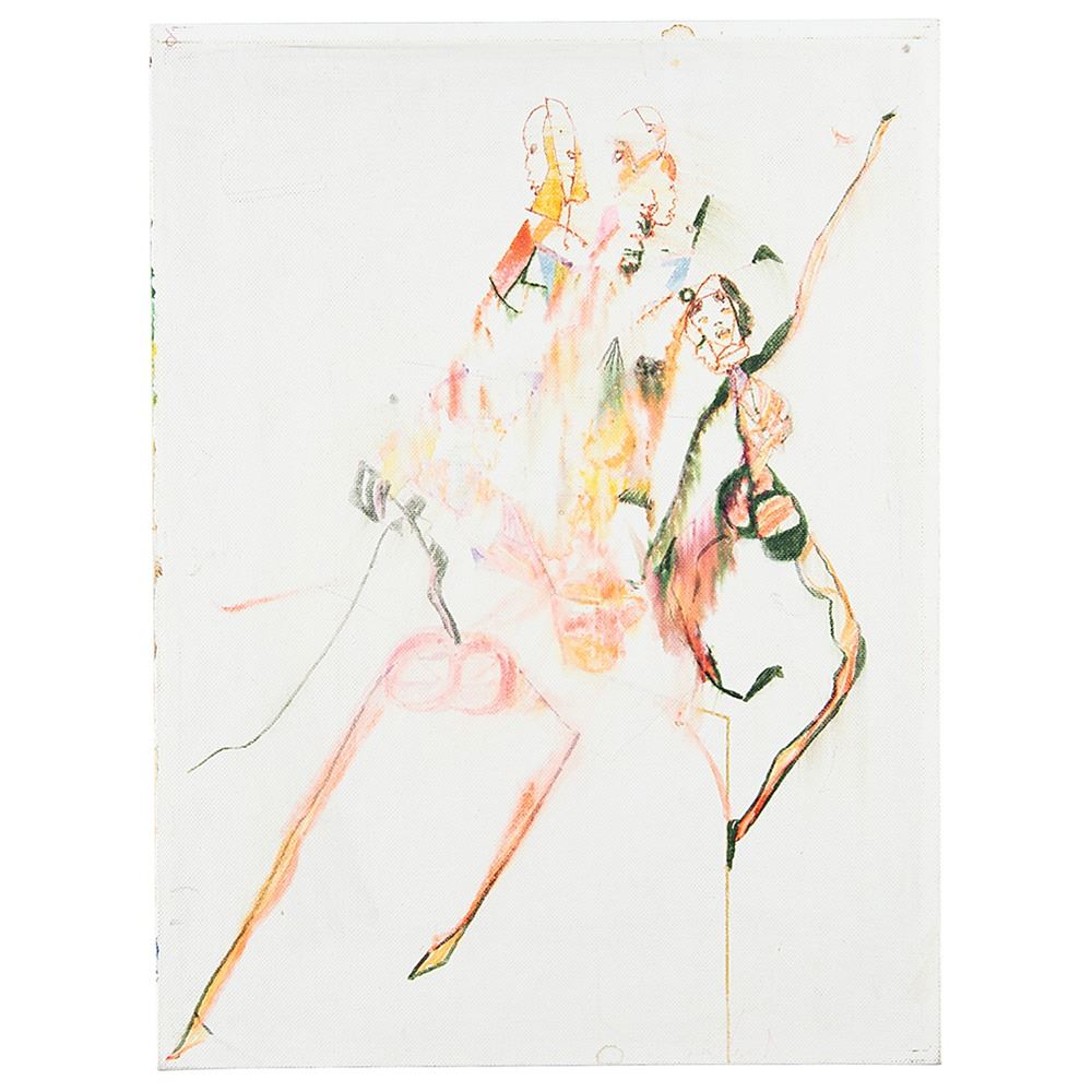 Sought-after original artwork by Miles Davis on a white 12 x 16 canvas board, indistinctly signed along the bottom in pink, "Miles!" Accomplished in marker and watercolors, the piece is rendered in Davis's typical abstract artistic style, portraying several dancers and wonderfully evoking their movements—perhaps to jazz or something more eclectic. Inscribed on the reverse by Davisin pink felt tip, "The best, Dr. Francis!" In fine condition, with some subtle light dampstaining.
