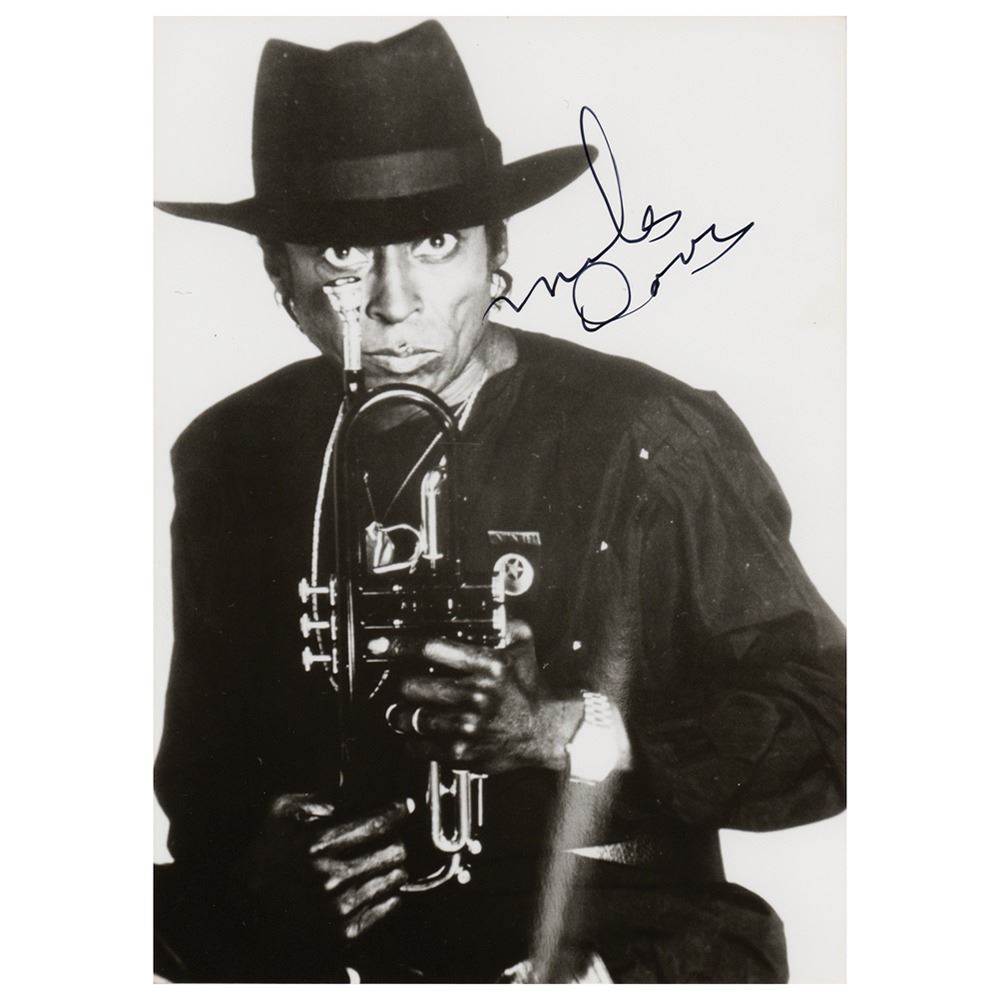Glossy 5 x 7 photo of Miles Davis dressed in black and holding his trumpet, signed in black felt tip. In very fine condition.
