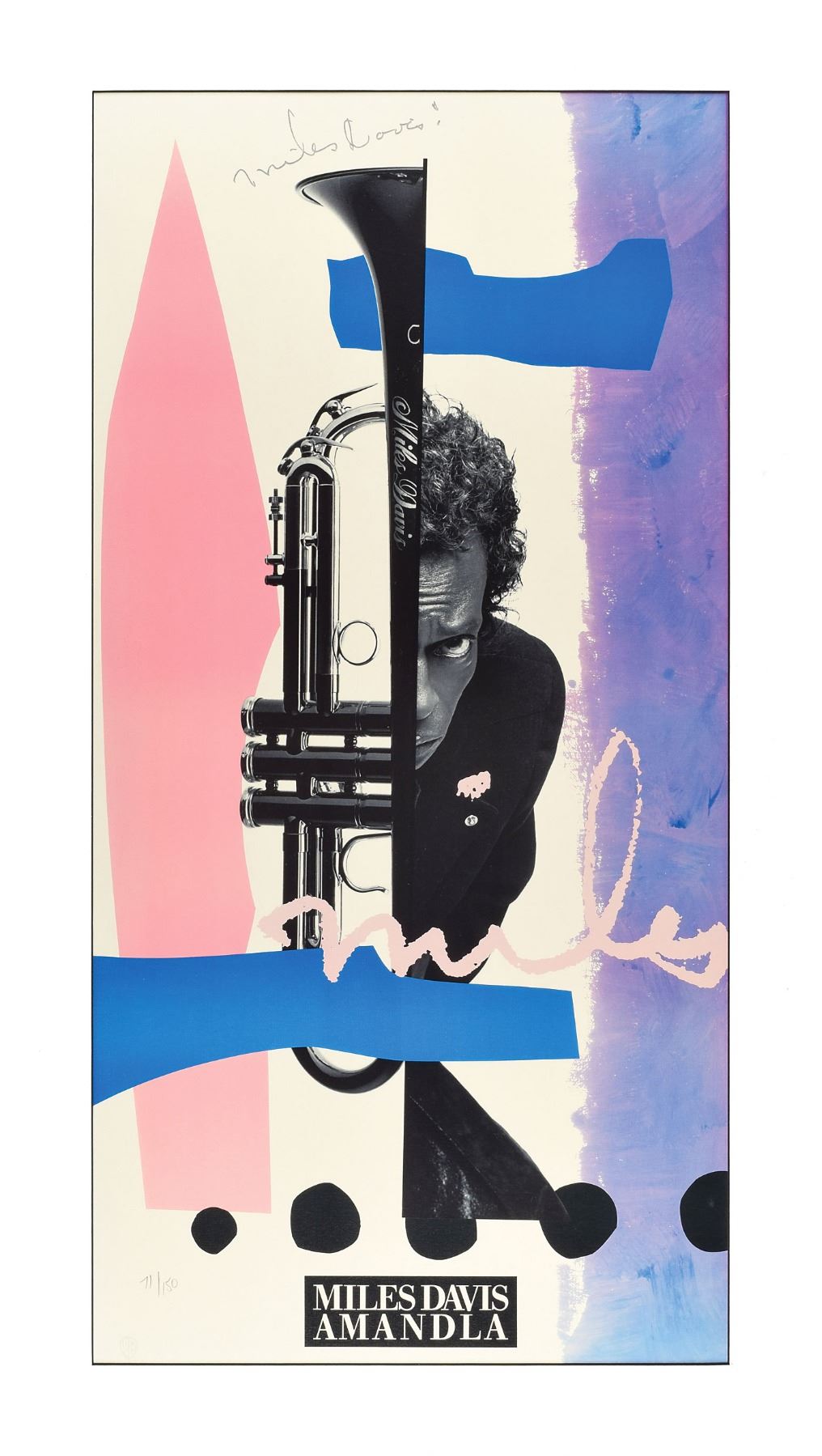 Visually stunning limited edition color 17 x 34 Warner Bros. promotional poster on textured art paper for Miles Davis's 1989 album Amandela, numbered 71/150, signed in the upper portion in silver ink, "Miles Davis!" Matted to an overall size of 22 x 38.75. In fine condition. Davis signed just 150 of these fabulous posters to be used as promotional items. A highly uncommon and visually appealing poster.