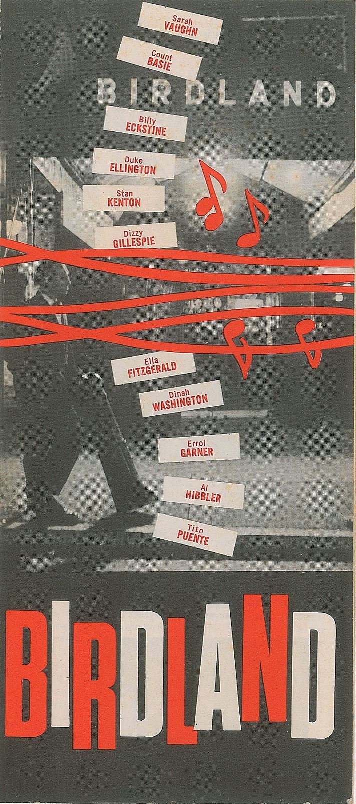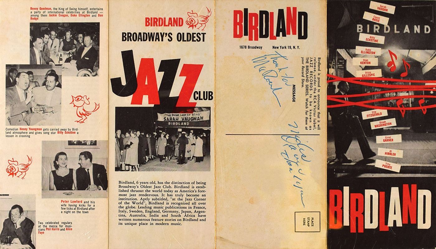 Fantastic vintage flyer for the Birdland jazz club at 1678 Broadway in New York City, 8.5 x 3.75, signed on the reverse in blue ballpoint, "Miles Davis, thank you" and "Thank you, Max Roach." Inside, the pamphlet depicts several of the iconic club's regular acts and patrons, including Dean Martin and Jerry Lewis, Marlon Brando, Harry Belafonte, Dinah Washington, Duke Ellington, Stan Kenton, Paul Whiteman, Sammy Davis, Jr., Gary Cooper, Benny Goodman, and Henny Youngman. In fine condition, with some faint staining.
