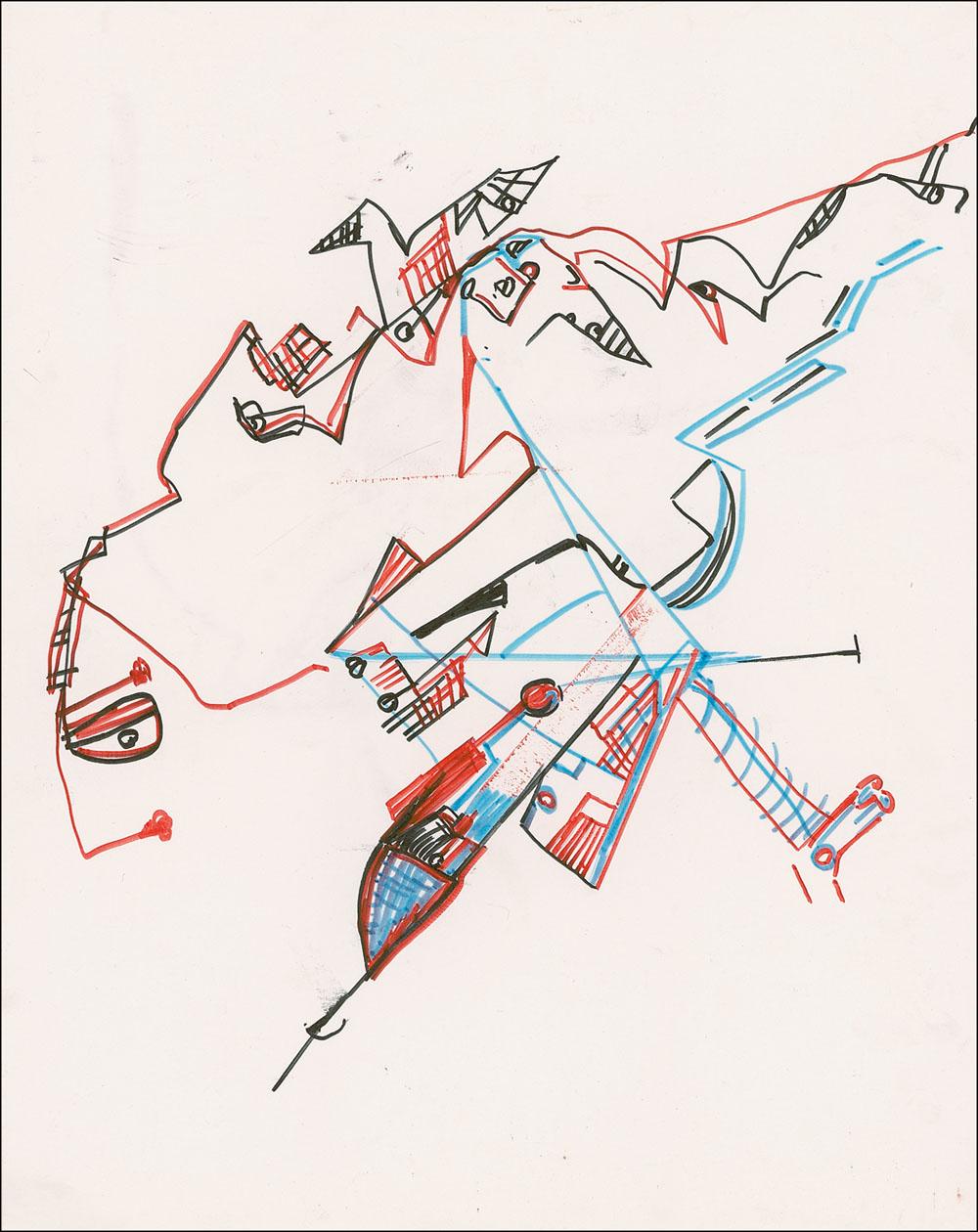 Original unsigned ink artwork of various abstract forms created by Davis on an 11 x 14 heavy stock sheet, most likely removed from a sketch pad. The convoluted image includes what appears to be a multi-colored horse head. In fine condition, with some light bends, surface impressions, and rippling and show-through from an aborted effort on the reverse.