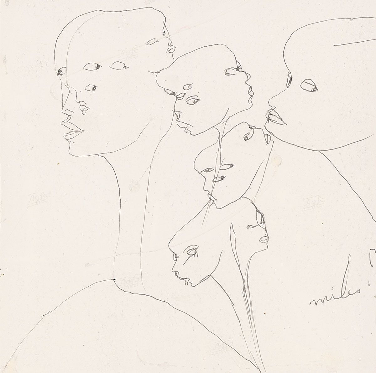 Original signed ballpoint sketch of surrealistic humanoid heads on the reverse of a trimmed glossy 6.75 x 6.5 photo, signed in ballpoint, “Miles.” In fine condition, with some light scattered marks, a couple spots of adhesive, and lightly trimmed edges.