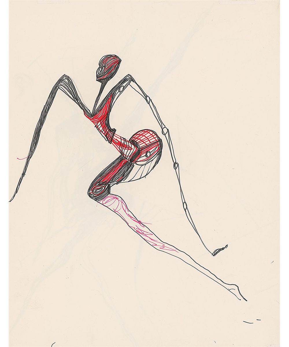 Two original unsigned pen and ink works of art by Davis on either side of a 11 x 14 heavy stock sheet, most likely removed from a sketch pad. Works are entitled ‘Abstract Woman #127A,’ and ‘Abstract Woman’ #127B. One image depicts a female form that appears to be dancing, with the image on the reverse a more abstract form with a face and long flowing hair visible at the top. In fine condition, with tape remnants to horizintal edges. Accompanied by a certificate of authenticity from Jonathan Poole Fine Art. Poole has represented the Davis Estate since 1991. Visually stunning, larger than usually seen, these are examples full of energy, with one portraying what may be construed as a “trumpeter” type character.