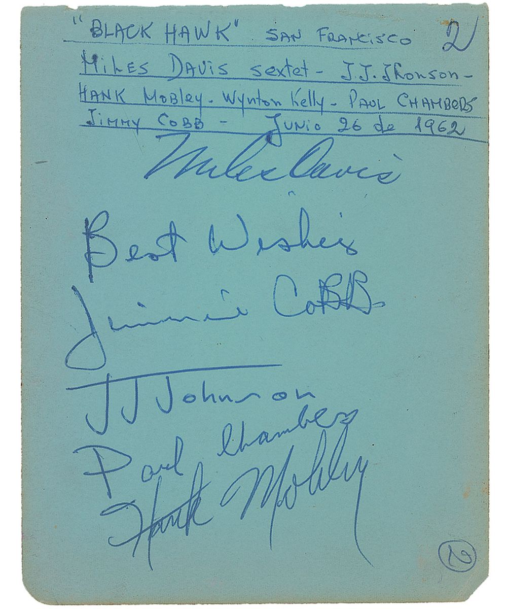 Vintage ballpoint signature, “Miles Davis,” as well as Quintet members Jimmie Cobb, J. J. Johnson, Paul Chambers, and Hank Mobley on a light blue 4.5 x 5.75 album page. Collector’s notations at top indicate signatures were obtained at the Black Hawk in San Francisco on June 26, 1962. In fine condition.