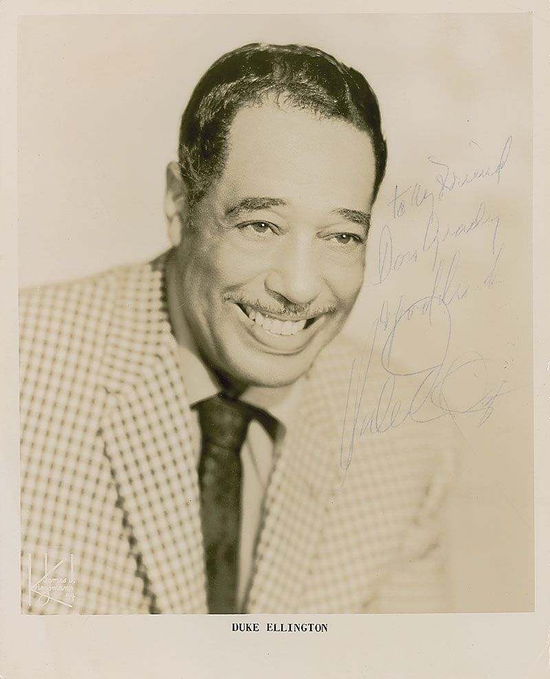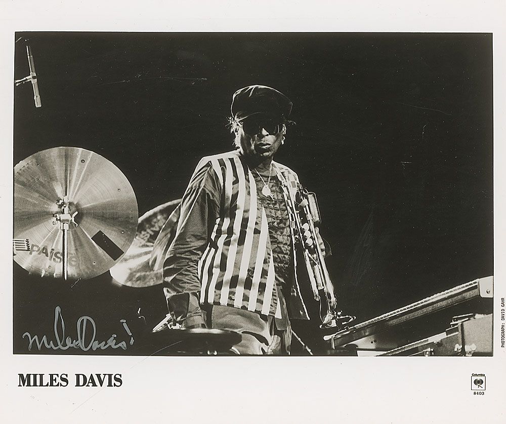 Glossy 10 x 8 Columbia Records publicity photo of Davis posing on stage with his trumpet, signed in silver ink. Some scattered creases and surface impressions, otherwise fine condition.