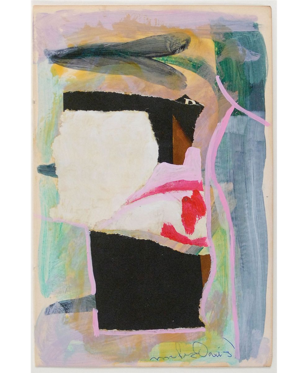 Original collage painting by Davis, mixed media on a 5 x 7.5 sheet, signed at the bottom in blue ink, “Miles Davis.” Matted to an overall size of 9 x 11.75. In fine condition. After suffering a stroke in the early 1980s, Davis was encouraged to take up drawing and painting as part of his rehabilitation. This particular piece is from that period, and was originally obtained by a fan in Munich, Germany, in 1987.