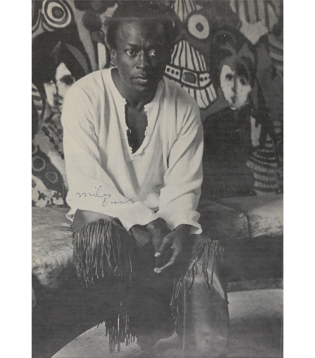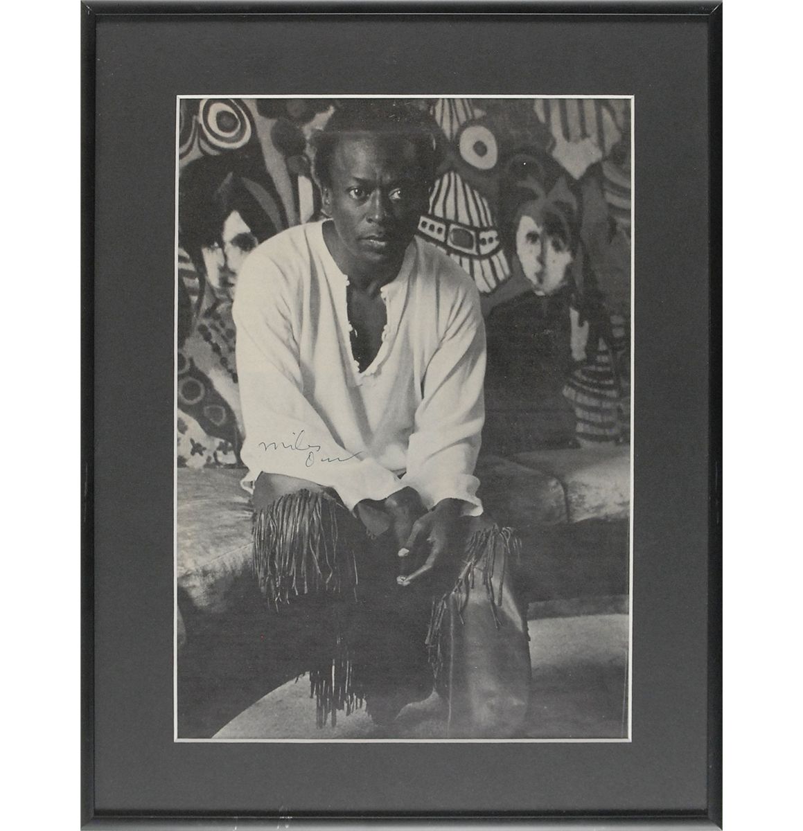 Uncommon 7.75 x 11 book photo of Davis wearing eccentric leather-fringed pants, signed against his white sleeve in black ink. Matted and framed to an overall size of 11 x 14. In fine condition. A larger image of the great trumpeter than typically seen.