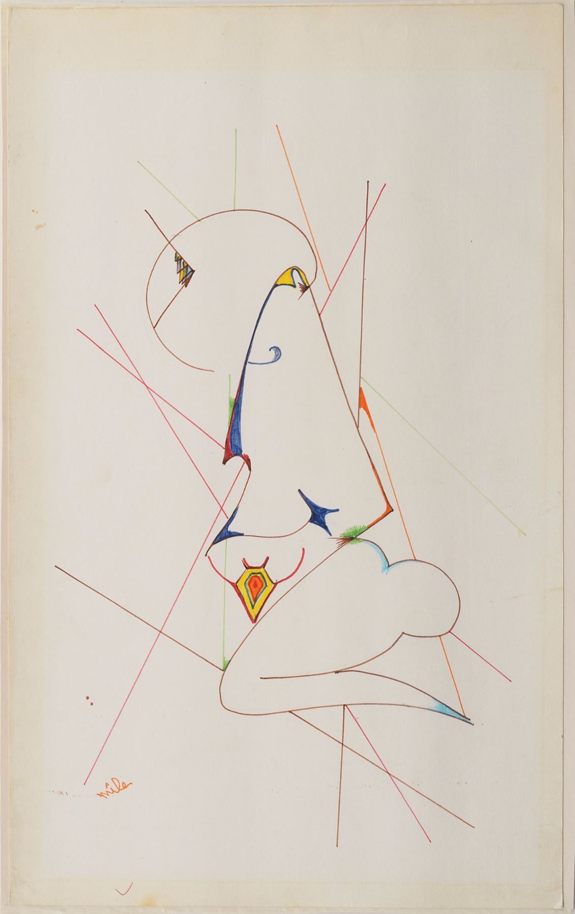 Original artwork by Miles Davis entitled 'African Dancer,' accomplished in graphite and colored marker on an off-white 13.25 x 22 sheet of artist's paper, signed in the lower left in thin orange marker, "Miles." Affixed to a slightly larger mount. Rolled and in fine condition, with light toning to the perimeter from prior display. Accompanied by a Miles Davis Exhibition invitation, and a letter of provenance and a certificate of authenticity signed by Jonathan Poole.
