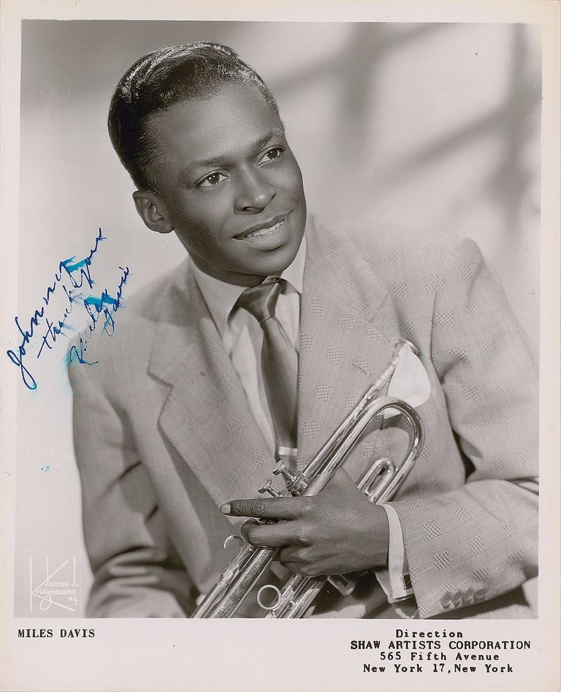 Superb vintage glossy 8 x 10 publicity photo of a young Davis holding his trumpet by James J. Kriegsmann, signed and inscribed in blue fountain pen, "Johnny, Thank you, Miles Davis.” In fine condition, with smudging to the handwriting. Accompanied by an unsigned photo of Davis tying his shoelaces. A magnificent early signed photo of the jazz virtuoso—signed images of Davis at the start of his legendary career are seldom offered and highly desirable.