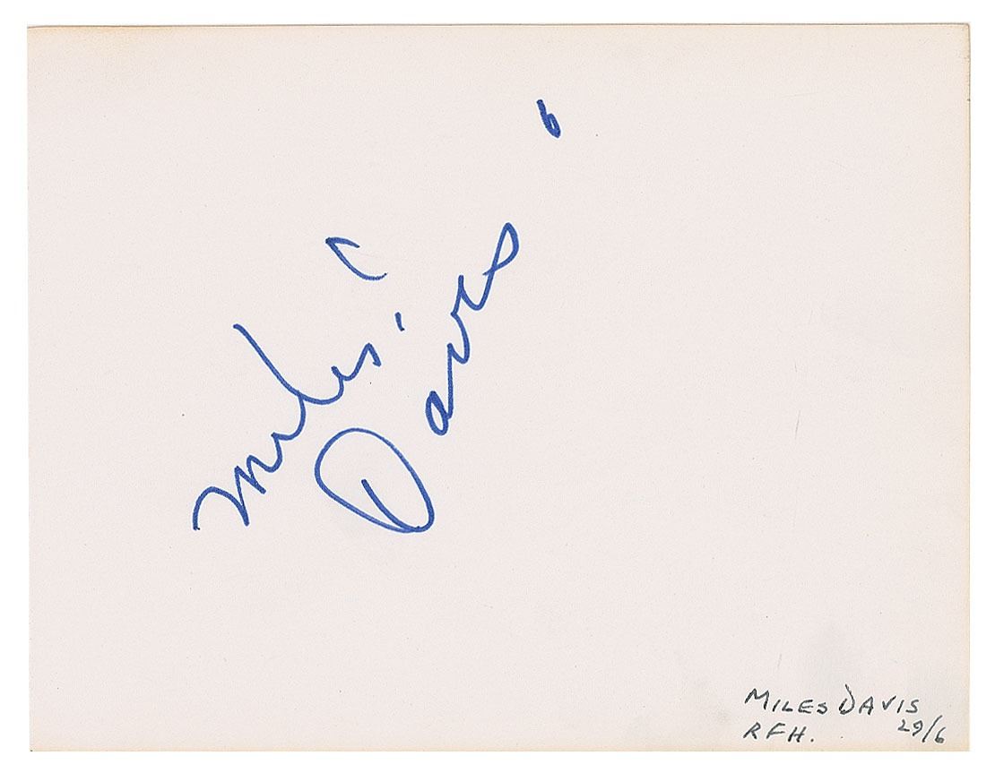 Desirable felt tip signature, "Miles Davis,” on an off-white 5.5 x 4.25 album page, with a collector's notation indicating that it was signed at the Royal Festival Hall in London on June 29, [1987]. In fine condition.