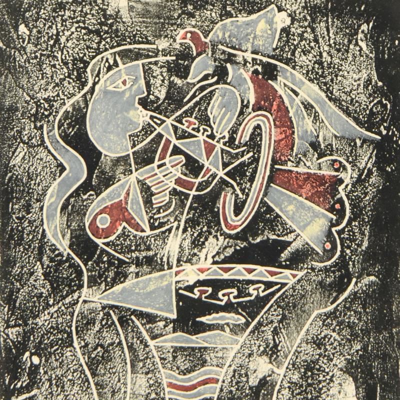 This is a unique variation mixed media linocut on paper, AP numbered 1/10 by Neal Doty (1941-2016), hand signed by the artist. This piece comes custom framed. Includes Certificate of Authenticity. This piece comes from Neal Doty's personal collection and was received directly from Doty's Estate. Measures approx. 22.5" x 27" (frame), 12" x 16" (image).