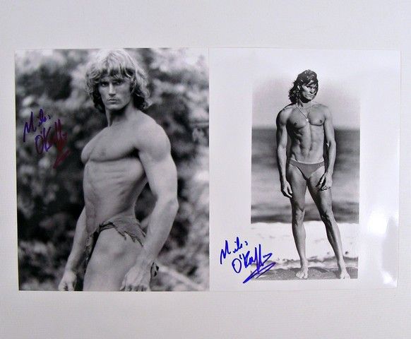 Considered to have one of the best physiques in Hollywood (compared many times to Michelangelo's David), the striking Miles O'Keeffe is perhaps best known as "Tarzan, The Ape Man" (1981) with Bo Derek as "Jane", as well as Ator in "The Blade Master" (1984), These are two astonishing photos showing off all that made him famous, both signed by Miles O'Keeffe. B&W, 8"x10".