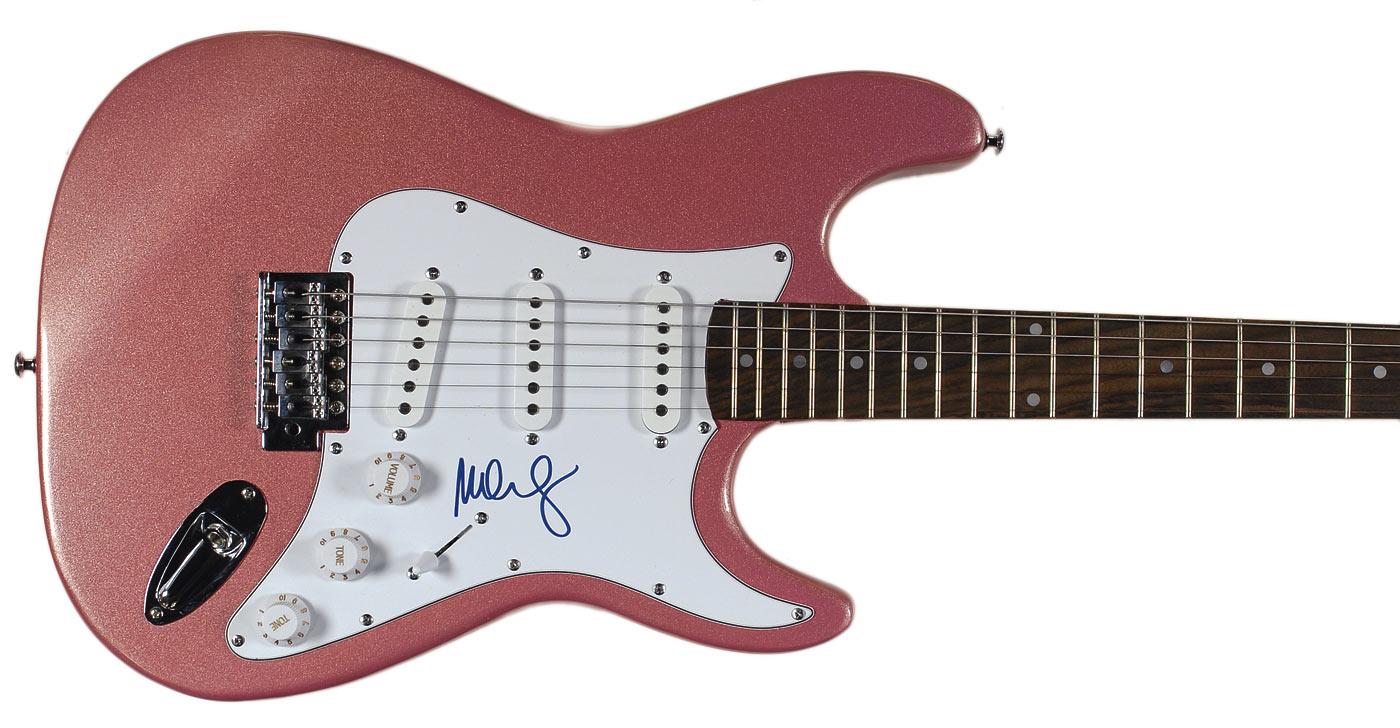 Pink-bodied Austin Bazaar ‘stratocaster-style’ electric guitar, signed on the white pickguard in blue felt tip. In fine condition. Accompanied by a photo taken at time of signing. Oversized. Pre-certified PSA/DNA and RRAuction COA.