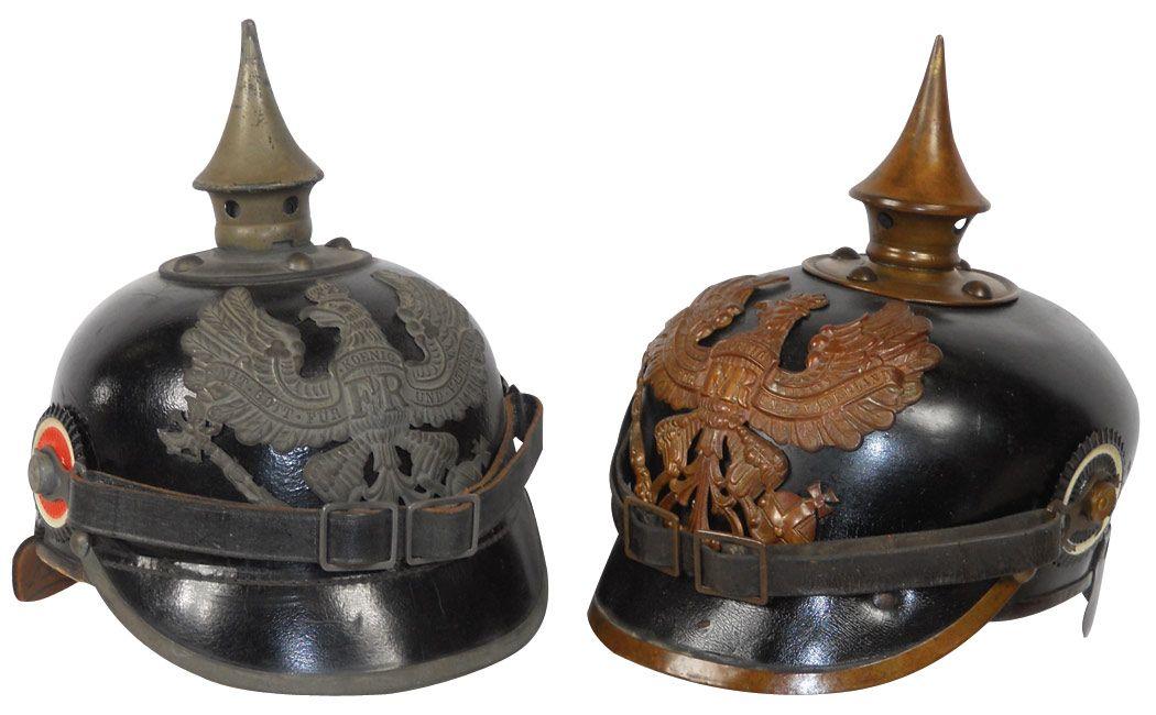 Militaria, (2) helmets, wartime Expedient (riveted visor), Prussian E.M. (unusual variation) & wartime Prussian infantry helmet (stamped B.A. IV under visor), both w/eagle hat badges, both Exc orig cond.