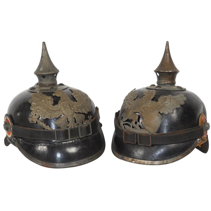 Militaria, (2) helmets, wartime Prussian infantry, both w/eagle hat badges that read Mit Gott Fur Koenig Und Vaterland FR, both VG to Exc cond.