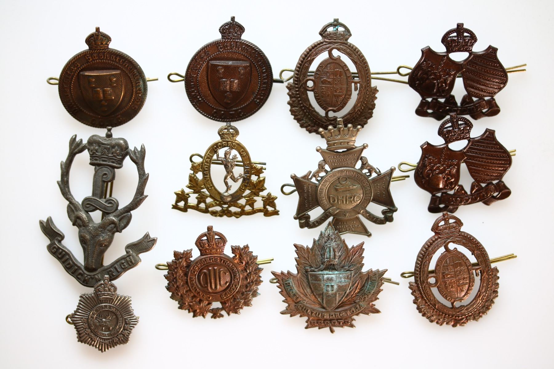 Militaria Badges; Lot includes WW2 Loyola College COTC Cap Badge(2), Universitas Saskatchewan COTC Badge(2), University of Manitoba Badge(2), Bishop College COTC, Seaforth Highlanders, Signals, Canadian Officers Training Corp, Canadian Dufferin, Sault Ste Marie & Sudbury Regiment & Haldimand Rifles. Lot of 14 Cap and Collar badges. See Pictures.