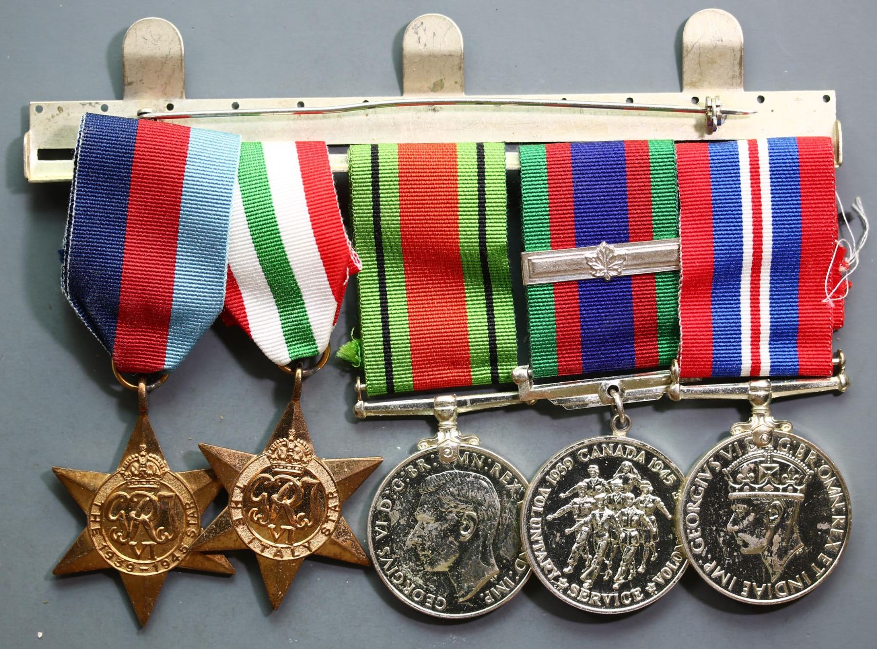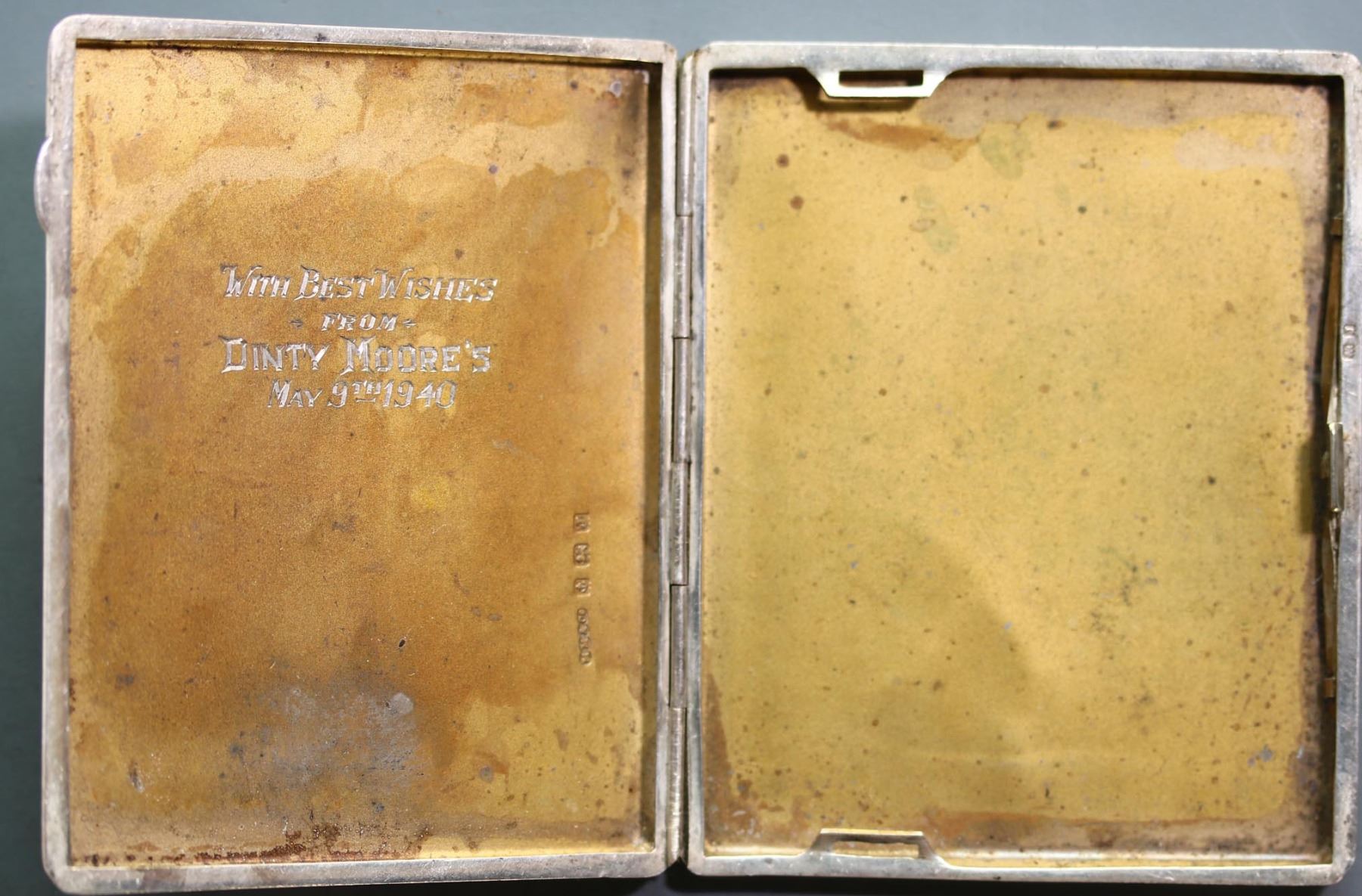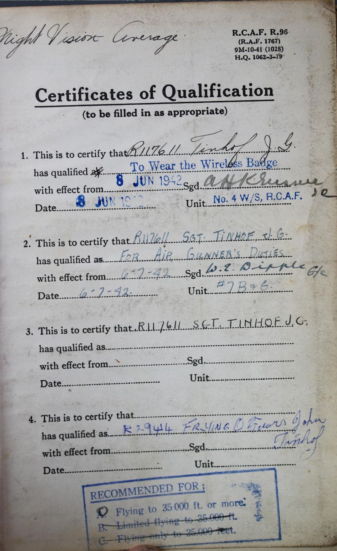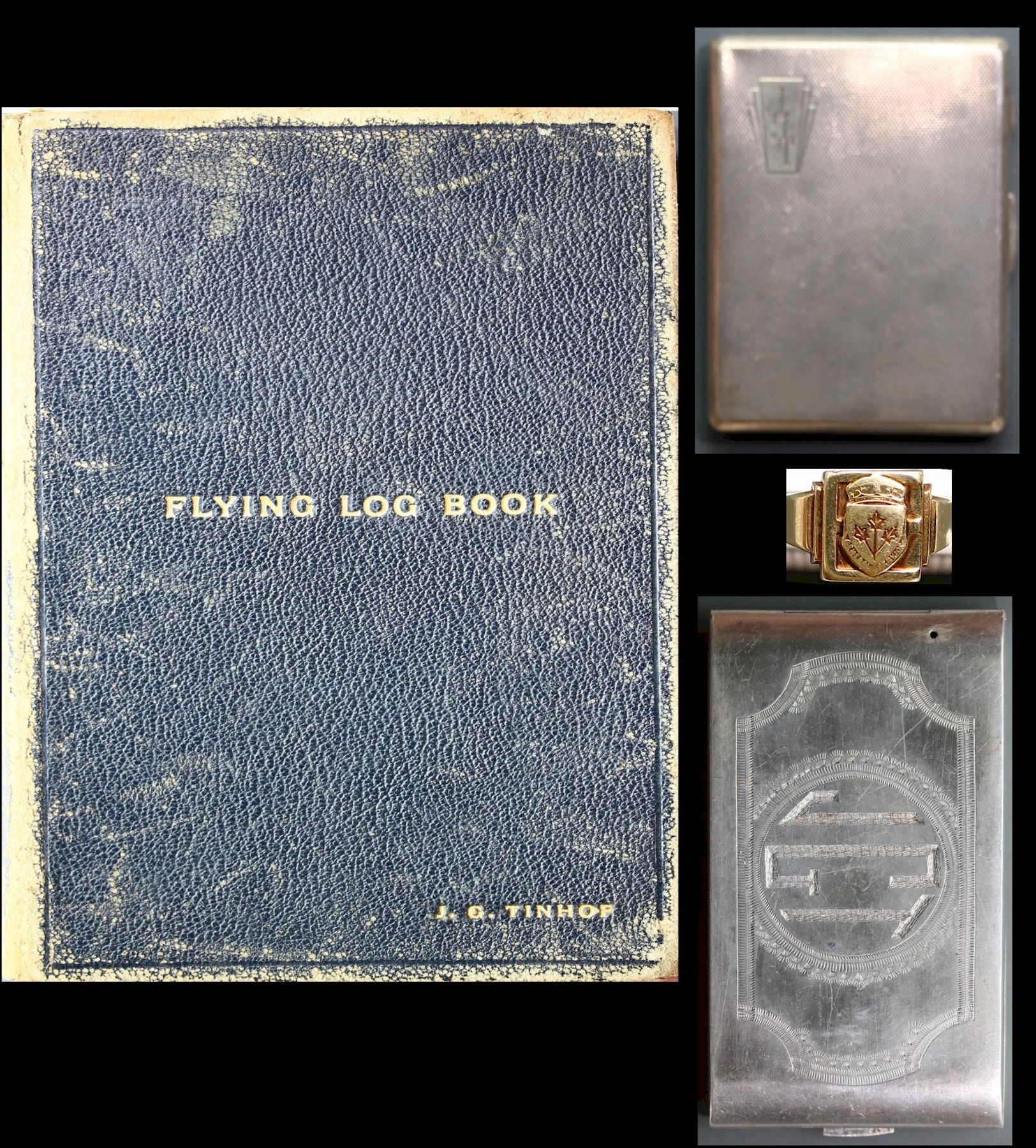 Militaria Ephempera; WW2 Flying Log Book belonging to ''R117611 J.G. Tinhof No.4 W/S RCAF. Over 700 logged hours detailed inside. Booklet is inscribed to Tinhof. Comes with grouping of 5 WWII medals, The 1939-45 Star, France and Germany Star, Defence, Volunteer & 1939-45 War Medals. Also includes silver cigarette cases(2) both inscribed with initials and Gold Ring (14kt 12.4grs) received for General Service 1939-45 w/inscription inside ring. Interesting Lot, important to note that our research was not able to find supplementary documentation. See Pictures.