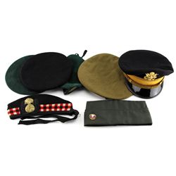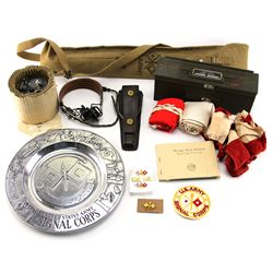 US ARMY SIGNAL CORPS LOT 12" pewter plate, tool pouch with folding knife and pliers, flag kit with 4 flags, hb-7 headphones, contractor unit B...