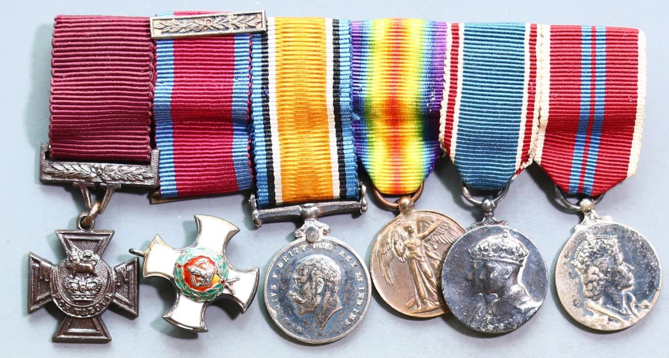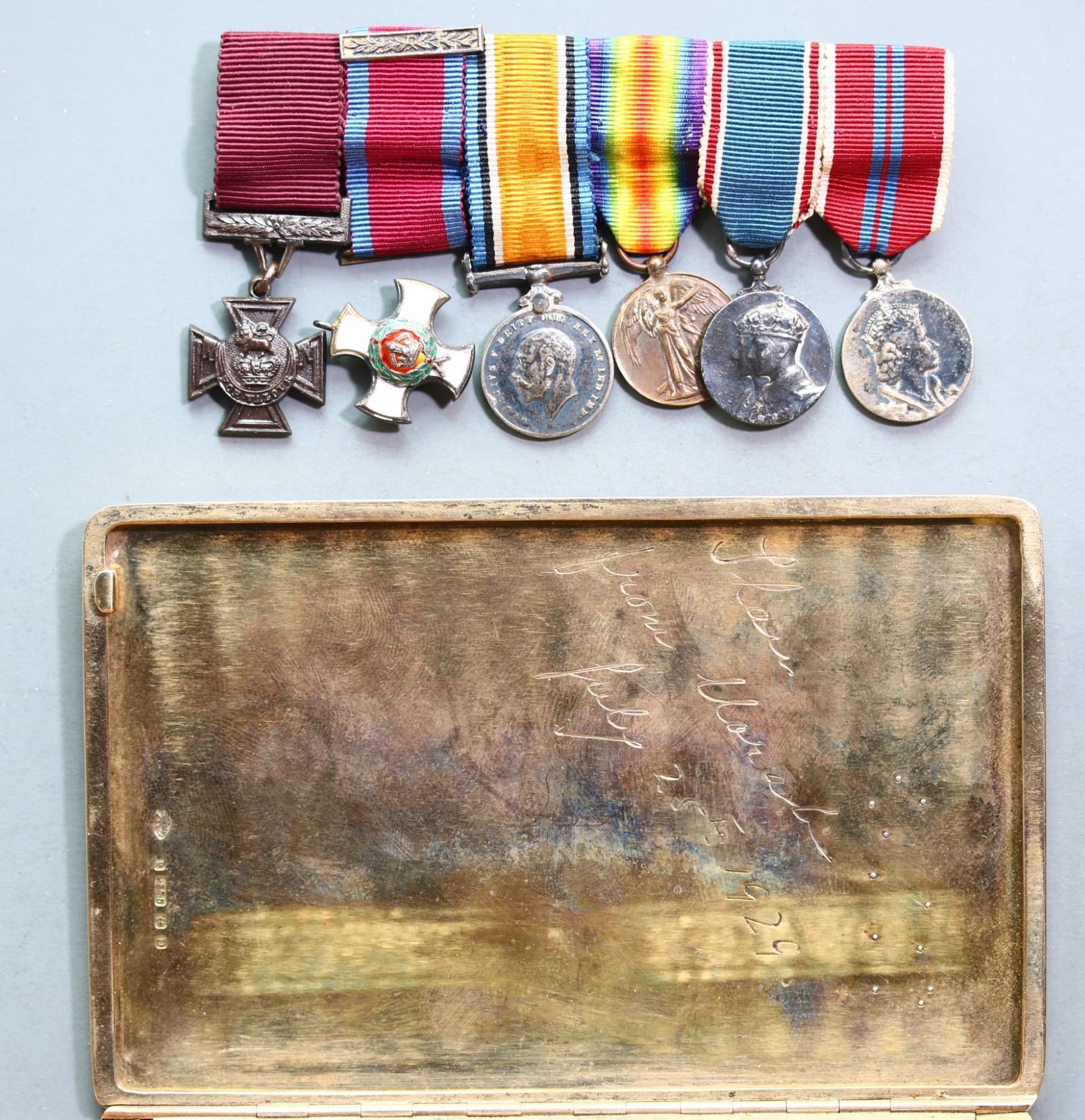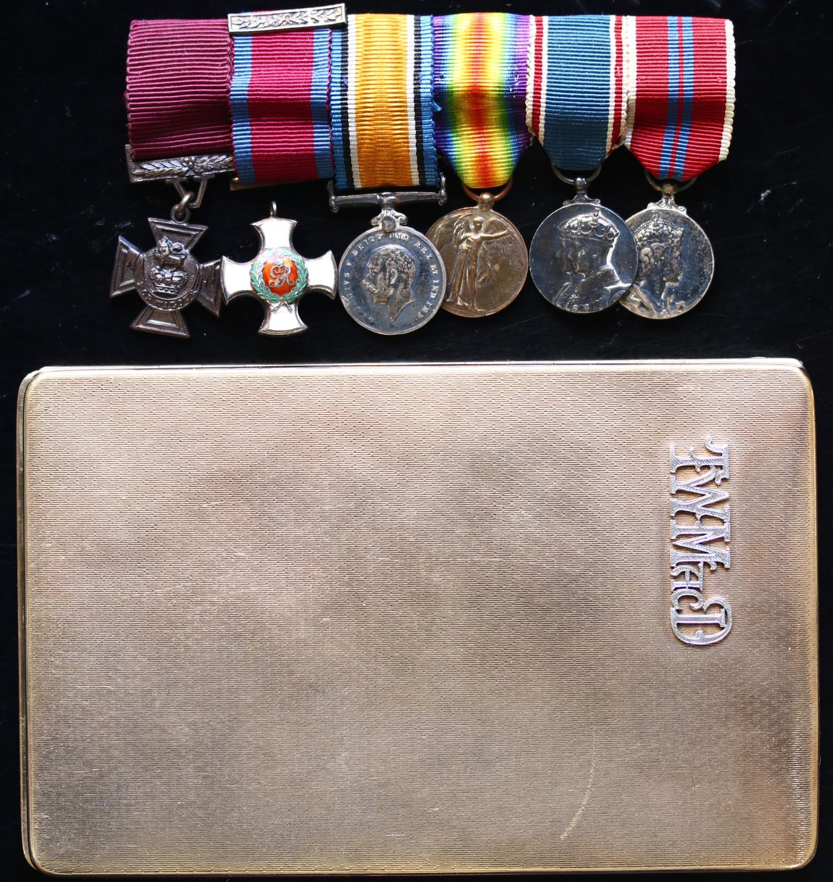 Militaria Medals; Canadian Grouping 6 Medals (Miniature Dress Medals) includes The Victoria Cross, Distinguished Service Order (DSO), 1914-18 British War Medal, Victory Medal, 1937 Jubilee & 1953 Coronation Medals. Comes with a Birks Gold cigarette case stamped (9) ,375 gold,m 169.9 grms. Gold content is $7500+ based on spot as of Oct.28th. With TWMacD on the outside and inscribed on the inside ''Thain from Uor ab'' dated July 25th 1929. Records show this as belongig to Captain Thain Wendall MacDowell VC, DSO in the Great War. Awarded his Victoria Cross for valour in the presence of the enemy at Vimy Ridge. It was during this battle that Captain MacDowell would prove himself to be among the ultimate badasses of the Great War. Canadian Military honours from members who received the Victoria Cross are seldom seen and or offered outside museums. View carefully, The DSO ribbon and medal are detached. See Pictures.