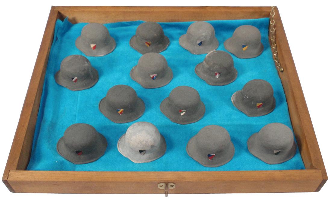 Militaria, pre-Nazi (1934) helmet insignia display, 14 different examples, possibly used as a teaching aid during the war, 2"H x 3.25"W.