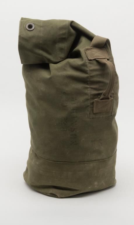 Militaries type duffel bag full of fatigue shirts and trousers some with patches from artillery 7 blouses, 5 trousers, cap and laundry bag. Est.: $75-$150
