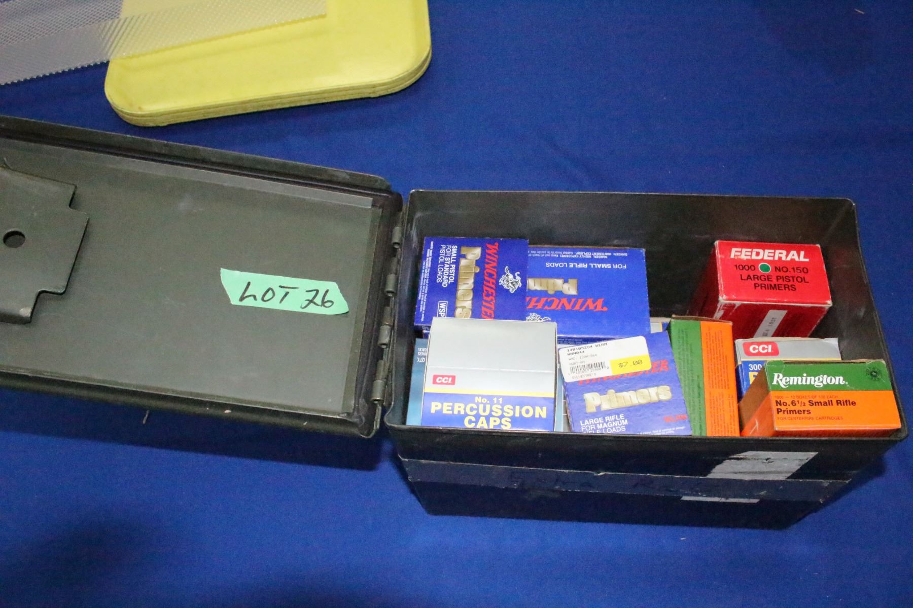 Military Ammo Box c/w : Lrg. Pistol Primers (approx. 3000); Small Rifle Primers (approx. 2000) & Small Pistol Primers (approx. 6000)