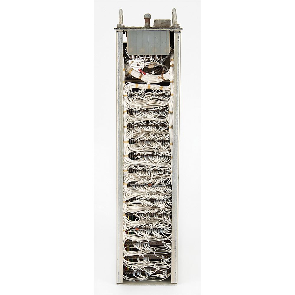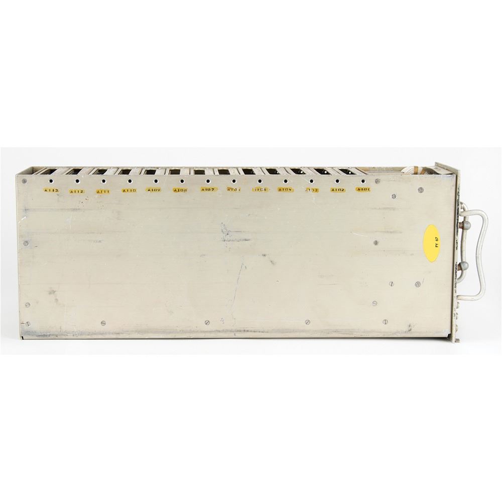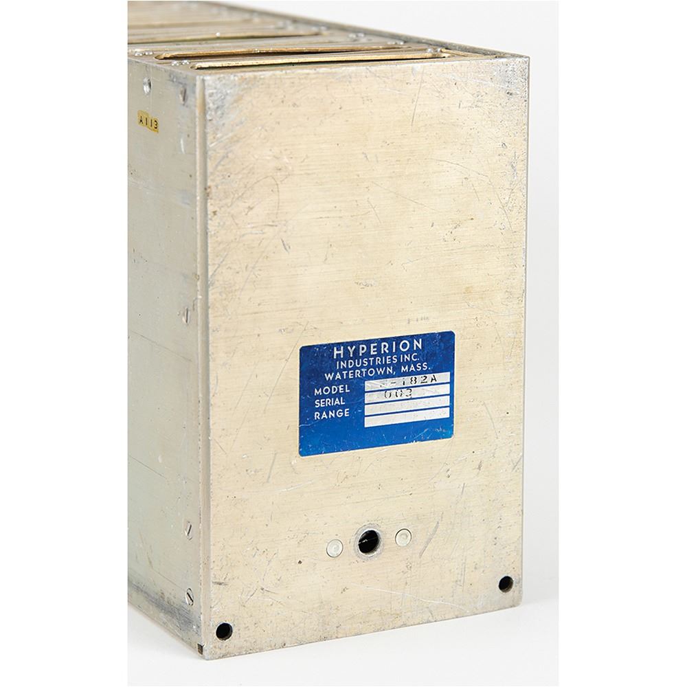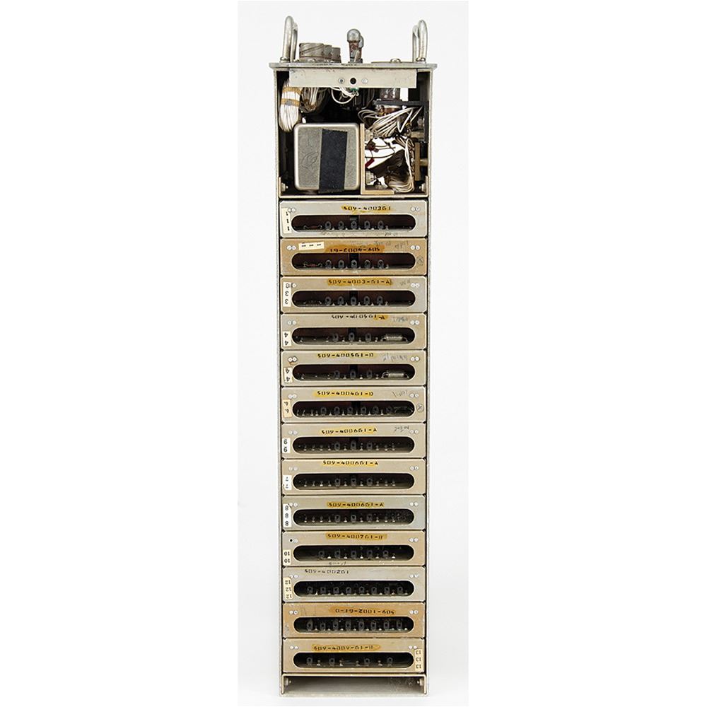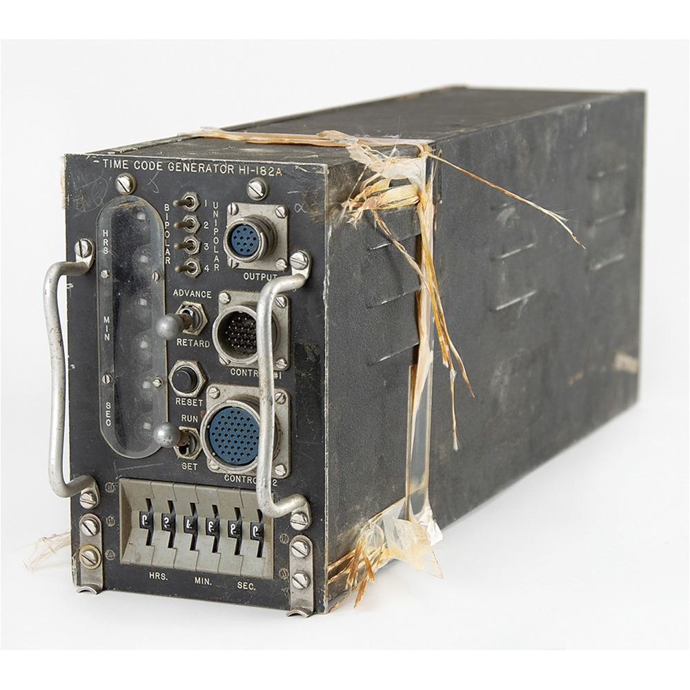 Vintage time code generator for an undetermined military aviation application, measuring approximately 5" x 8" x 21", marked on the front panel: "Time Code Generator HI-182A." The control panel boasts four bipolar/unipolar toggle switches, Nixie tube digit displays for "Hrs," "Min," and "Sec," and manual rotating time code switches. The time code generator pulls out from its housing, revealing its internal wiring and modules.