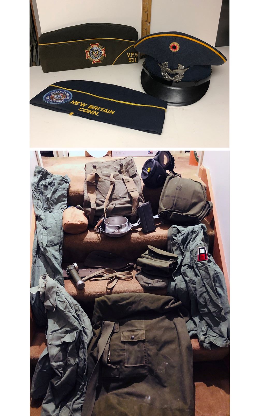 Estate military lot includes combat fatigues, backpacks, duffles, flashlight, 3 military hats, one looks to be Russian.