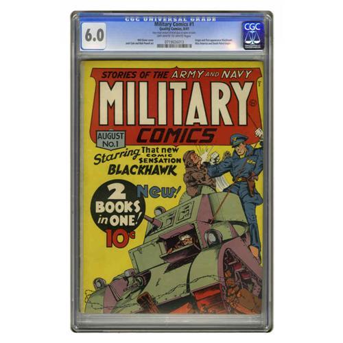<B>Military Comics #1 (Quality, 1941) CGC FN 6.0 Off-white to white pages.</B></I> This Golden Age key key issue features the origin and first appearance of the high-flying hero Blackhawk, a tough nut who survived the decline of superhero popularity, the backlash against comics during the early '50s, and loss of his publisher (DC bought the character along with others when Quality folded in 1956). The cover is by the legendary Will Eisner, and the interior art was provided by Jack Cole, Fred Guardineer, and Bob Powell (as Bud Ernest). CGC notes: "Very small amount of dried glue on cover." Overstreet 2005 FN 6.0 value = $2,805. CGC census 12/05: 2 in 6.0, 3 higher.