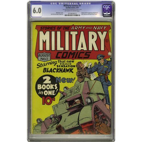 <B>Military Comics #1 (Quality, 1941) CGC FN 6.0 Off-white to white pages.</B></I> This Golden Age key issue features the origin and first appearance of the high-flying hero Blackhawk, a tough nut who survived the decline of superhero popularity, the backlash against comics during the early '50s, and loss of his publisher (DC bought the character along with others when Quality folded in 1956). The cover is by the legendary Will Eisner, and the interior art was provided by Jack Cole, Fred Guardineer, and Bob Powell (as Bud Ernest). CGC notes: "Very small amount of dried glue on cover." Overstreet 2006 FN 6.0 value = $2,727. CGC census 3/06: 2 in 6.0, 3 higher.