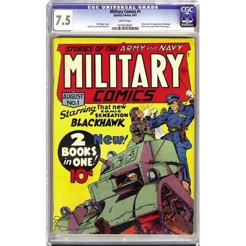 <B>Military Comics #1 (Quality, 1941) CGC VF- 7.5 White pages.</B></I> Only two copies of this key book have been graded higher by CGC to date, and this copy is very fresh-looking and appealing. This issue's got the first appearance and origin of Blackhawk, who endured all the way into the 1980s in various incarnations. Overstreet once attributed the success of the feature to "sterling Iger graphics (the shop's piece de resistance) and top-drawer scripting." Will Eisner, who was reportedly a co-creator of the team, drew the cover. Inside the comic (which is divided into "Army Section" and "Navy Section"), Blackhawk is drawn by Chuck Cuidera. The other artists include Jack Cole and Fred Guardineer. Overstreet 2006 VF 8.0 value = $6,363. CGC census 5/06: 1 in 7.5, 2 higher. <BR><BR><B>Important notice:</B> Heritage usually auctions material at the rate of 200-250 lots per hour. On some occasions eBay Live bid software or the Internet may not be able to keep up with the pace of the auction. We recommend placing a realistic absentee bid now as insurance to avoid disappointment. Occasionally the auctioneer may eliminate or reject an eBay Live bid, and the auctioneer may also reopen a lot after the close of the eBay live bidding (usually because we missed an audience bid), and may reject your bid even if it shows you as the winning bidder. By bidding via eBay Live, you agree that Heritage may award the lot to another bidder at its sole discretion under the circumstances described above or any other reasonable circumstances. Since eBay bids are not shown to us until we open the lot on the floor, we treat those bids just like floor bids. In most cases the floor responds before the eBay bid is presented to us, due to Internet lag time, so for consistency we have made it a policy that floor bids are always considered first over tie eBay live bids. Also please note that all Heritage lots purchased through eBay Live carry a 22.5% Buyer's Premium. Please make sure you read the Terms and Conditions before you bid. This lot is being auctioned in conjunction with a live floor auction by Heritage Auction Galleries. All final auction and invoice information will be supplied by Heritage Auction Galleries, and all other information should be considered preliminary. Lot:41001 <BR><BR><B>Winning Notification and Billing:</B> After the FINAL session in this auction is complete, Heritage will send e-mail and snail mail invoices. This process normally takes several days. All final auction and invoice information will be supplied by Heritage Auction Galleries, and all other information should be considered preliminary. <BR><BR>This auction will be conducted on a live auction floor and over the Internet through eBay Live. If you choose to place an absentee bid, please take a moment to <font color='#0000ff'><u><a href='http://pages.ebay.com/liveauctions/help/before/laabsentee.html'>learn how eBay Live absentee bidding works</a></u></font><font color='#000000'>