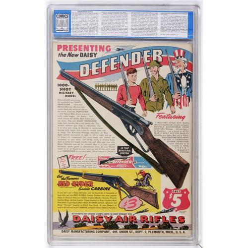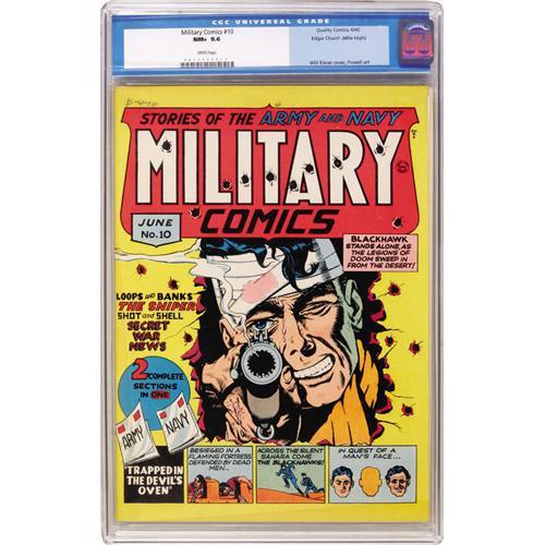 <B>Military Comics #10 Mile High pedigree (Quality, 1942) CGC NM+ 9.6 White pages.</B></I> ""Classic (Will) Eisner cover,"" says Overstreet, and how can you argue with that after having a look at it? And the image is best enjoyed on a NM+ copy like this Mile High gem. The issue's interior artists include Bob Powell. Overstreet 2006 NM- 9.2 value = $1,650. CGC census 3/07: 1 in 9.6, none higher.<BR><BR><b>Shipping:</b> Slabbed Comic (<a target=""_blank"" href=""http://www.heritageauctions.com/common/shipping.php"">view shipping information</a>)