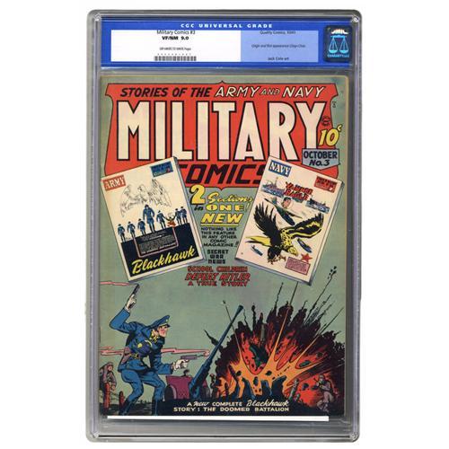 <B>Military Comics #3 (Quality, 1941) CGC VF/NM 9.0 Off-white to white pages.</B></I> Here's a high-grade copy of an historic issue featuring the origin and first appearance of Chop Chop. Chuck Cuidera's busy cover is supported by interior artwork from Cuidera, Jack Cole, Fred Guardineer, Al McWilliams, Bob Powell, and Klaus Nordling. Overstreet 2006 VF/NM 9.0 value = $2,269; NM- 9.2 value = $3,100. CGC census 3/06: 1 in 9.0, 1 higher.