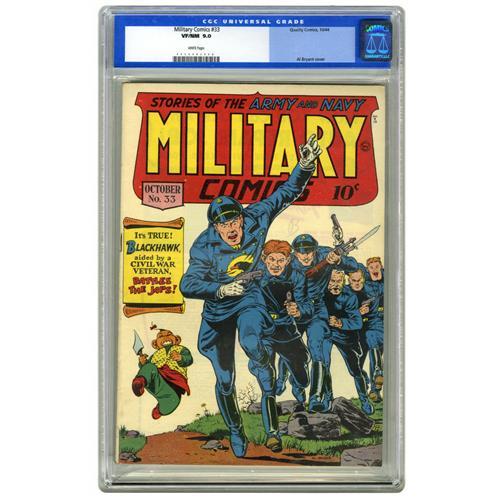 <B>Military Comics #33 (Quality, 1944) CGC VF/NM 9.0 White pages.</B></I> This is the highest-graded copy yet certified of this white-cover issue. Revealed in this ish: Blackhawk Island has moved, and it's located in the midst of the group of islands known as... Japan! How convenient for the anti-Axis activities of everyone's favorite international squad. The cover art is credited to Al Bryant. Overstreet 2006 VF/NM 9.0 value = $504; NM- 9.2 value = $685. CGC census 3/06: 1 in 9.0, none higher.