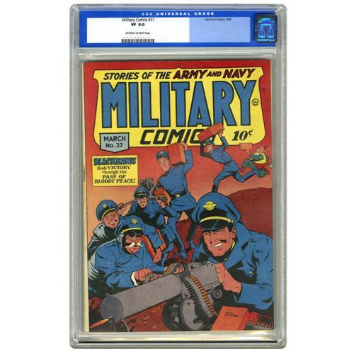 <B>Military Comics #37 (Quality, 1945) CGC VF 8.0 Off-white to white pages.</B></I> Alex Kotzky cover. Overstreet 2006 VF 8.0 value = $323. CGC census 3/06: 1 in 8.0, 2 higher.