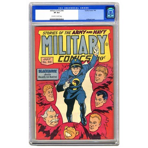 <B>Military Comics #40 (Quality, 1945) CGC VF 8.0 Off-white to white pages.</B></I> Al Bryant cover. Overstreet 2006 VF 8.0 value = $323. CGC census 3/06: 2 in 8.0, 1 higher.