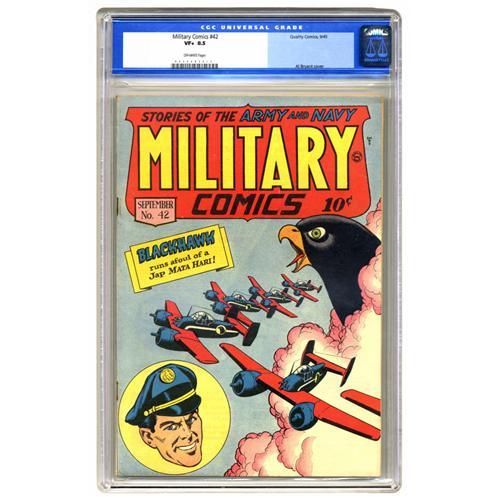<B>Military Comics #42 (Quality, 1945) CGC VF+ 8.5 Off-white pages.</B></I> This is the only copy of the issue that CGC has certified as of this writing. The cover art is credited to Al Bryant. Overstreet 2006 VF 8.0 value = $323; VF/NM 9.0 value = $504. CGC census 3/06: 1 in 8.5, none higher.