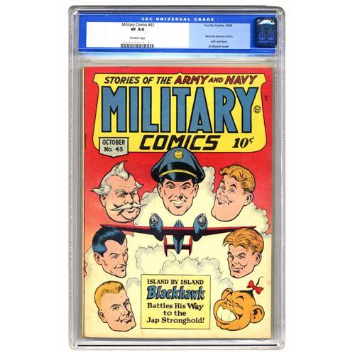 <B>Military Comics #43 (Quality, 1945) CGC VF 8.0 Off-white pages.</B></I> Last issue with this title (series became <B>Modern Comics</B></I>). Al Bryant cover. Overstreet 2006 VF 8.0 value = $323. CGC census 3/06: 3 in 8.0, 1 higher.