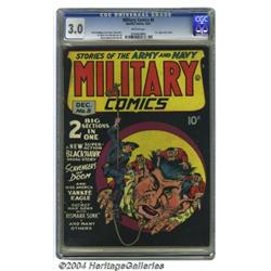 <B>Military Comics #5 (Quality, 1941) CGC GD/VG 3.0 Brittle pages.</B></I> First appearance of the Sniper. Chuck Cuidera cover. Cuidera, Fred Guardineer, Bob Powell, Dave Berg, and Klaus Nordling art. Overstreet 2004 GD 2.0 value = $152; VG 4.0 value = $304. <BR><BR><B>Important notice:</B> Heritage usually auctions material at the rate of 200-250 lots per hour. On some occasions eBay Live bid software or the Internet may not be able to keep up with the pace of the auction. We recommend placing a realistic absentee bid now as insurance to avoid disappointment. Occasionally the auctioneer may eliminate or reject an eBay Live bid, and the auctioneer may also reopen a lot after the close of the eBay live bidding (usually because we missed an audience bid), and may reject your bid even if it shows you as the winning bidder. By bidding via eBay Live, you agree that Heritage may award the lot to another bidder at its sole discretion under the circumstances described above or any other reasonable circumstances. Since eBay bids are not shown to us until we open the lot on the floor, we treat those bids just like floor bids. In most cases the floor responds before the eBay bid is presented to us, due to Internet lag time, so for consistency we have made it a policy that floor bids are always considered first over tie eBay live bids. Also please note that all Heritage lots purchased through eBay Live carry a 20% Buyer's Premium. Please make sure you read the Terms and Conditions before you bid. </span></font></tr></table></td></tr></table>