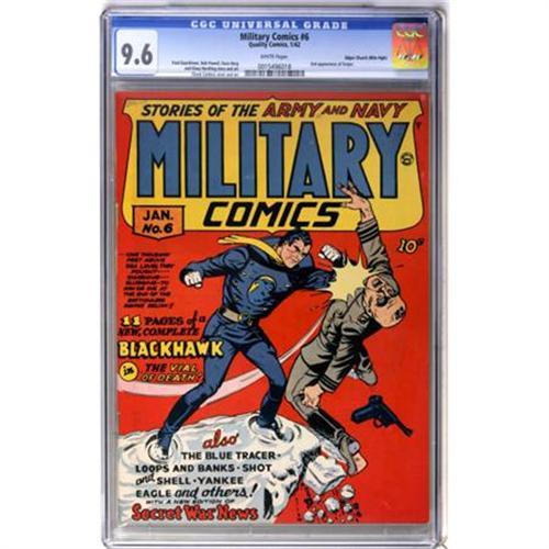 <B>Military Comics #6 Mile High pedigree (Quality, 1942) CGC NM+ 9.6 White pages.</B></I> This early issue in the run featured a Chuck Cuidera cover, and interior art from such notables as Cuidera, Fred Guardineer, Bob Powell, Dave Berg, Klaus Nordling, and Al McWilliams. The Photo-Journal Guide to Comic Books rates the issue "uncommon", which makes the Mile High Copy stand out even more. CGC has awarded a grade higher than FN 6.0 on only two occasions, and this one's far and away the best. Overstreet 2007 NM- 9.2 value = $1,525. CGC census 5/07: 1 in 9.6, none higher.<BR><BR><b>Shipping:</b> Comics - Slabbed (certified) (<a target="_blank" href="http://www.heritageauctions.com/common/shipping.php">view shipping information</a>)