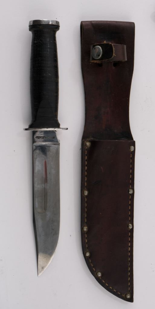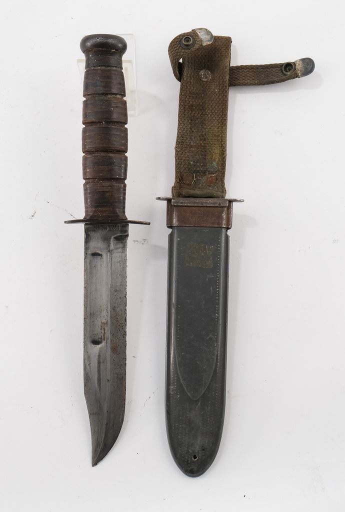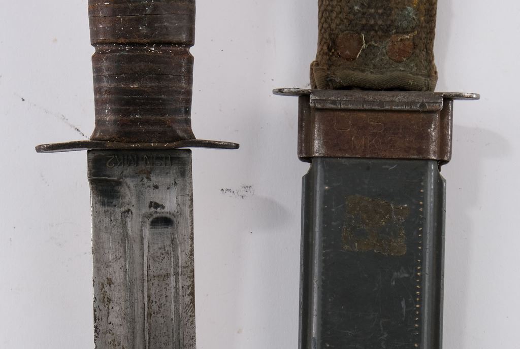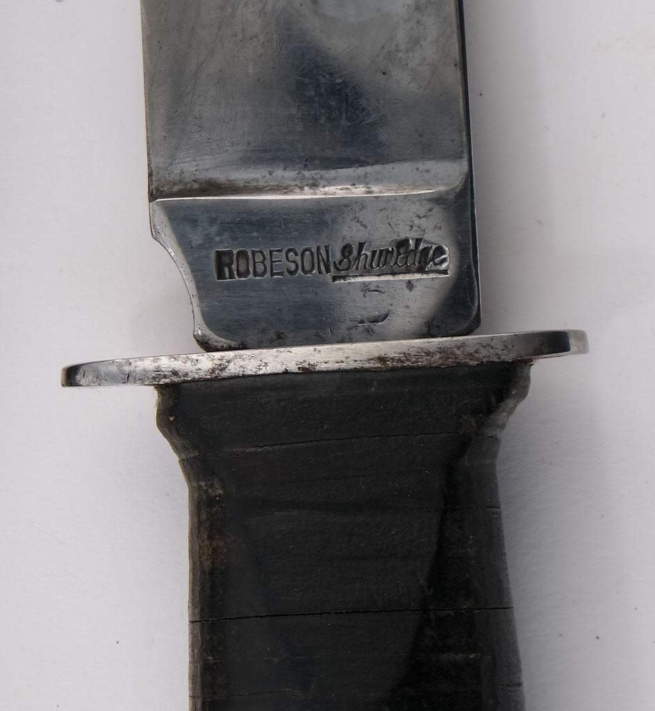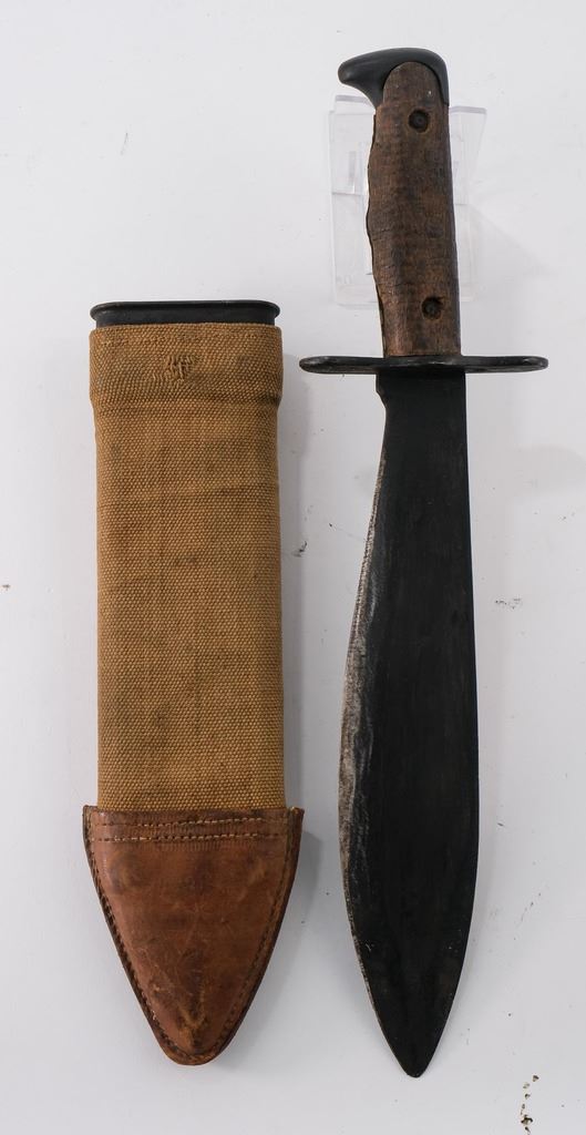 Includes a USA Robeson Shuredge Knife, with USA marked Leather Scabbard, A USN MK2 Ka-Bar Knife with Scabbard, and two WII Model 1917 Bolo knives with scabbards. All blades show sharpening, all pieces have areas of rust, preservative, and may be married scabbards. overall condition is Good or better, but each shows wear and use. Keywords: WWII, WWI, World War One Two, 1 2, US Navy, Army