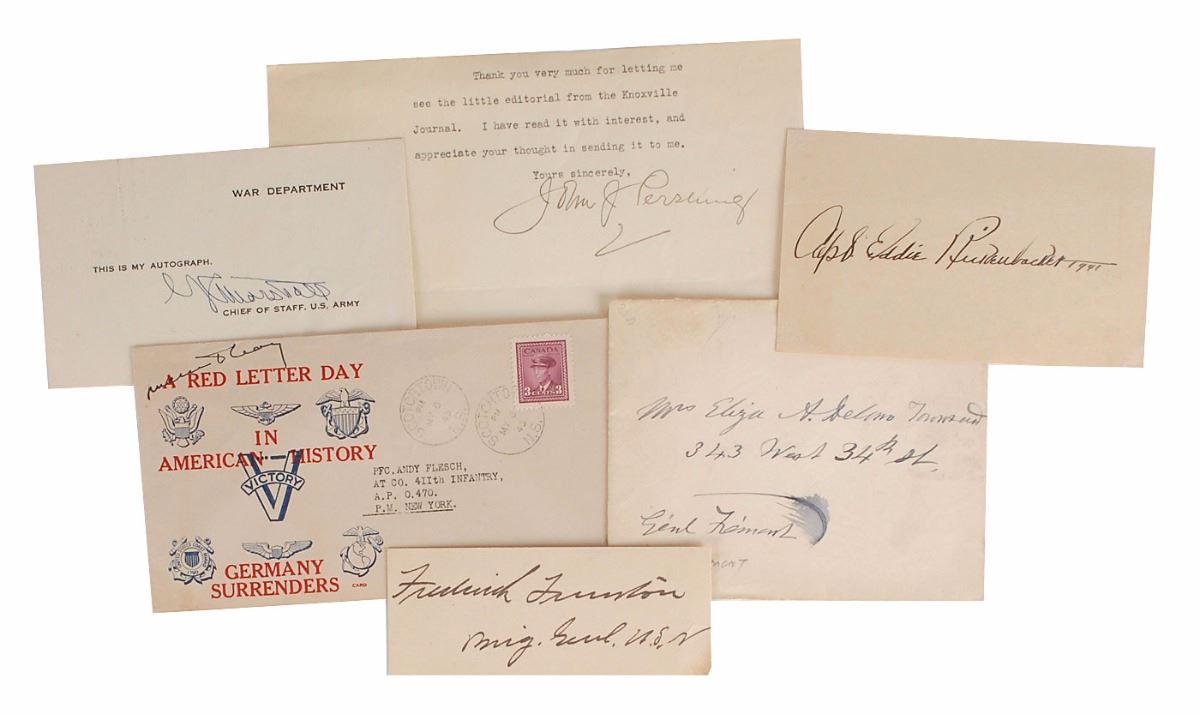 Collection of six items, each signed by a military figure, including: John C. Fremont (envelope); Frederick Funston (signature); Lucius D. Clay (cover); George C. Marshall (signature); John J. Pershing (partial TLS); and Eddie Rickenbacker (signature). Various scattered creases, and trimmed top edge of the Pershing, otherwise fine condition.
