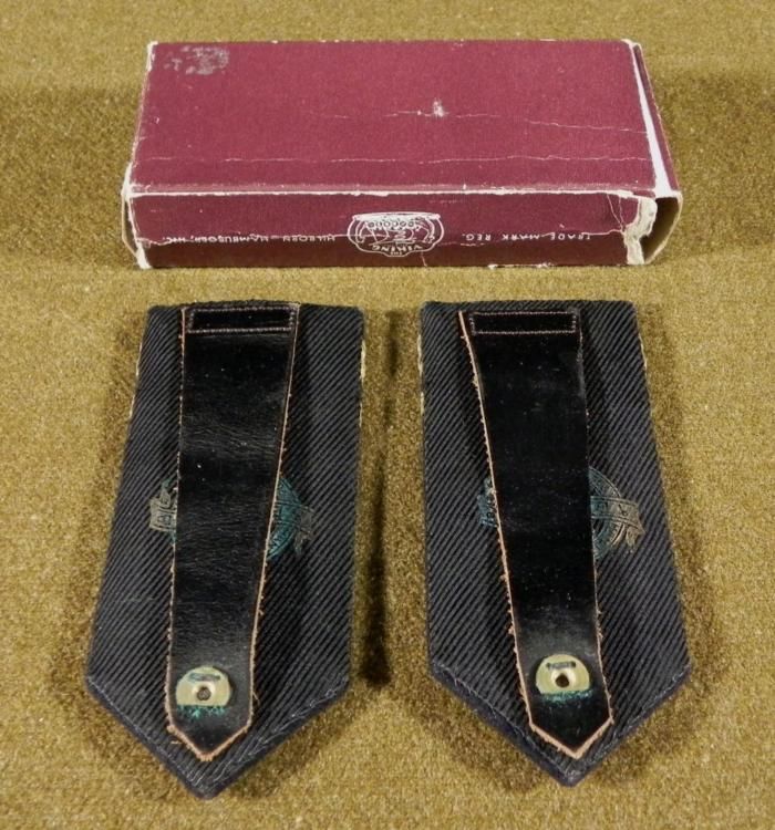This is a pair of U.S. Naval Boards in original box. The boards have gold embroidered leaves and stripes along with buttons. They were produced by the Meier company of Chicago, and maker logos are on back. The box is marked Military Insignia by Hilborn - Hamburger, Inc. The boards appear to be Senior Lieutenants. * * These are great, especially with the box.