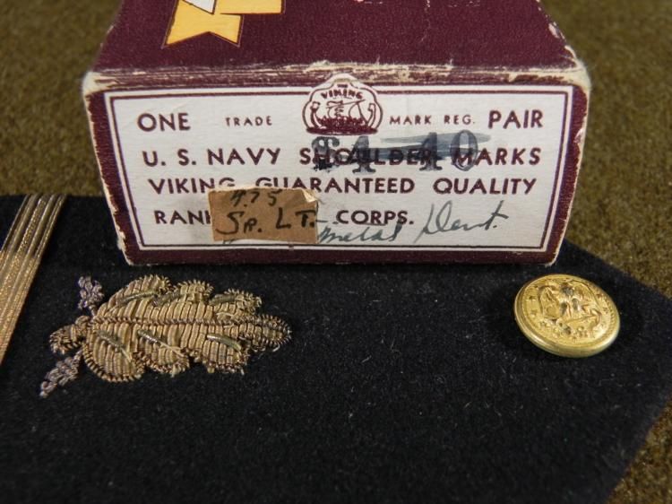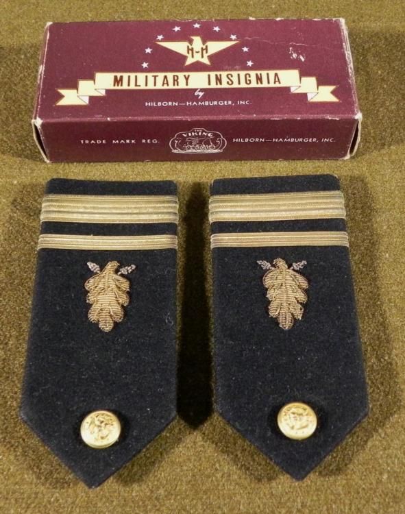This is a pair of U.S. Naval Boards in original box.  The boards have gold embroidered leaves and stripes along with buttons.  They were produced by the Meier company of Chicago, and maker logos are on back. The box is marked Military Insignia by Hilborn - Hamburger, Inc.  The boards appear to be Senior Lieutenants.   *  * These are great, especially with the box.
