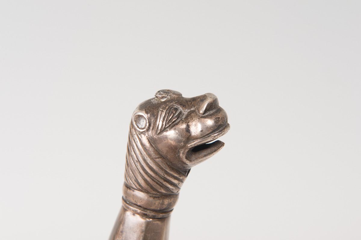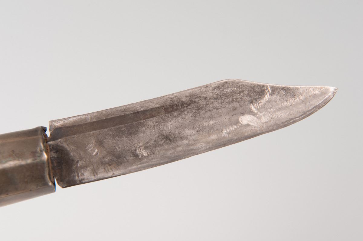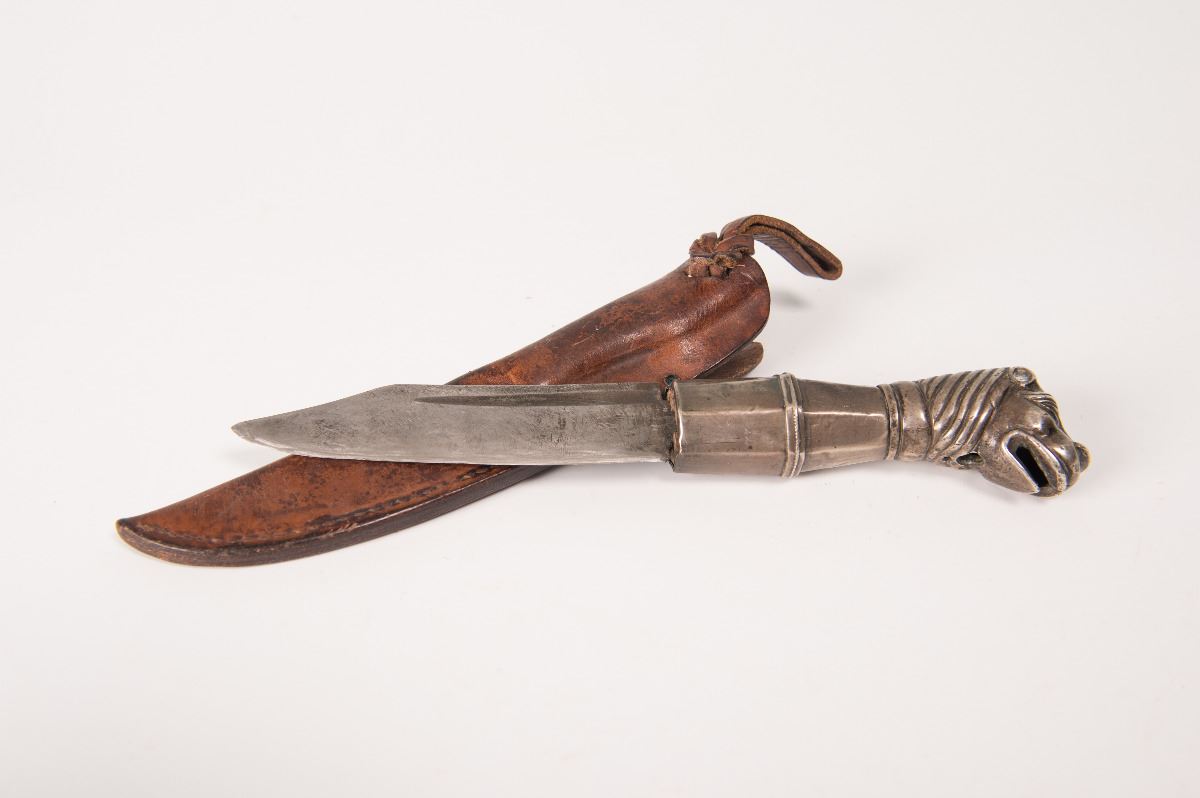 Military Knife. 9" overall. Made from Revolutionary War Silver Sword Hilt together with later blade in custom knife case. Dog head design on end of handle. Mid-19th century.