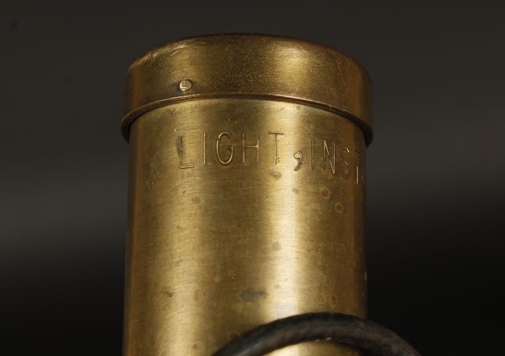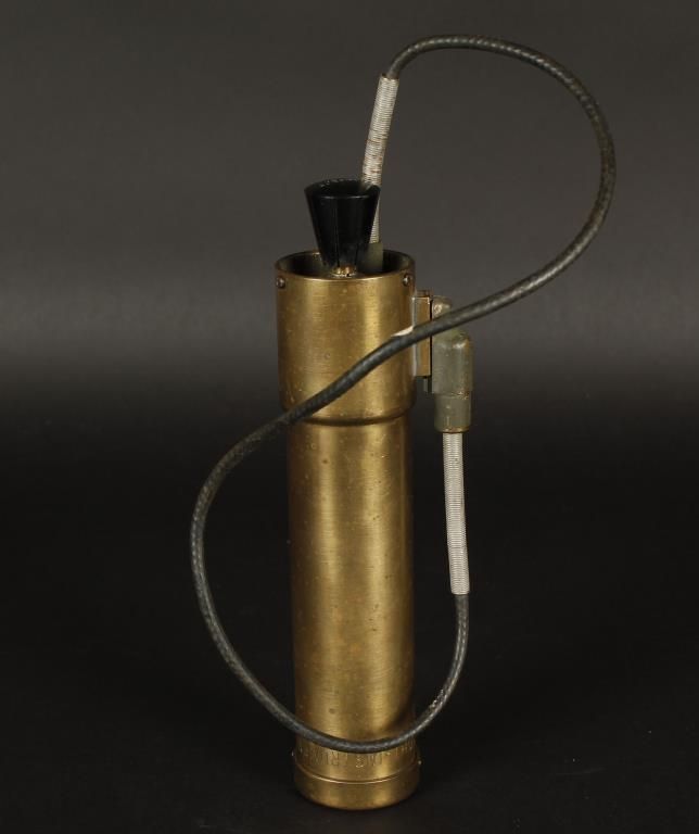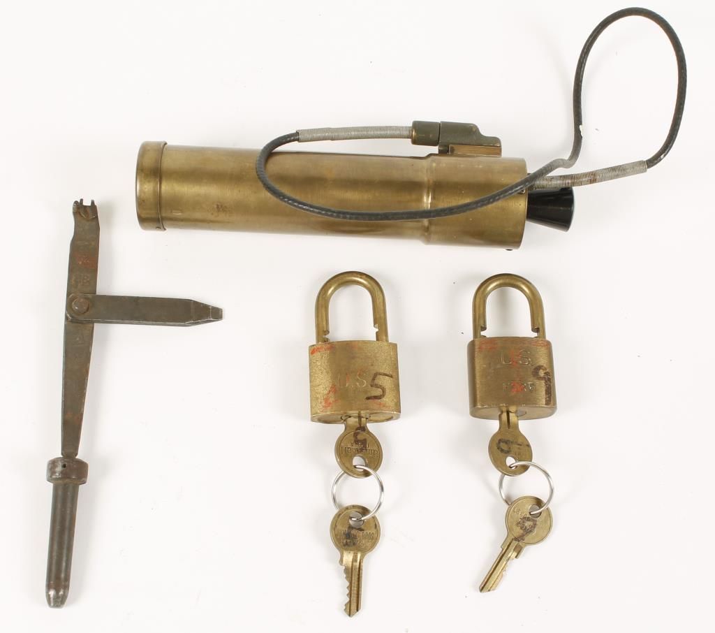 (1) Battery Operated military test light. Brass construction, twist knob switch, small light on end of flex shaft, approx 7-1/2" long, marked "Light, Instrument, M50". In unknown working condition. (1) Working padlock with (2) keys. Lock marked "U.S." on one side and "American, U.S.A." on the other. In used condition with some paint and markings. (1) Working padlock with (2) keys. Lock marked "U.S." and "FORT" on one side, and "L649" on top. In used condition with some paint and markings. Lot of (2) Take Down Tools. (1) Marked US.