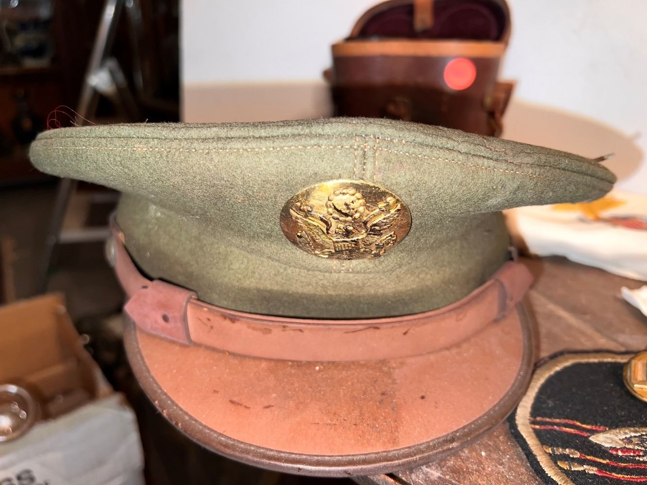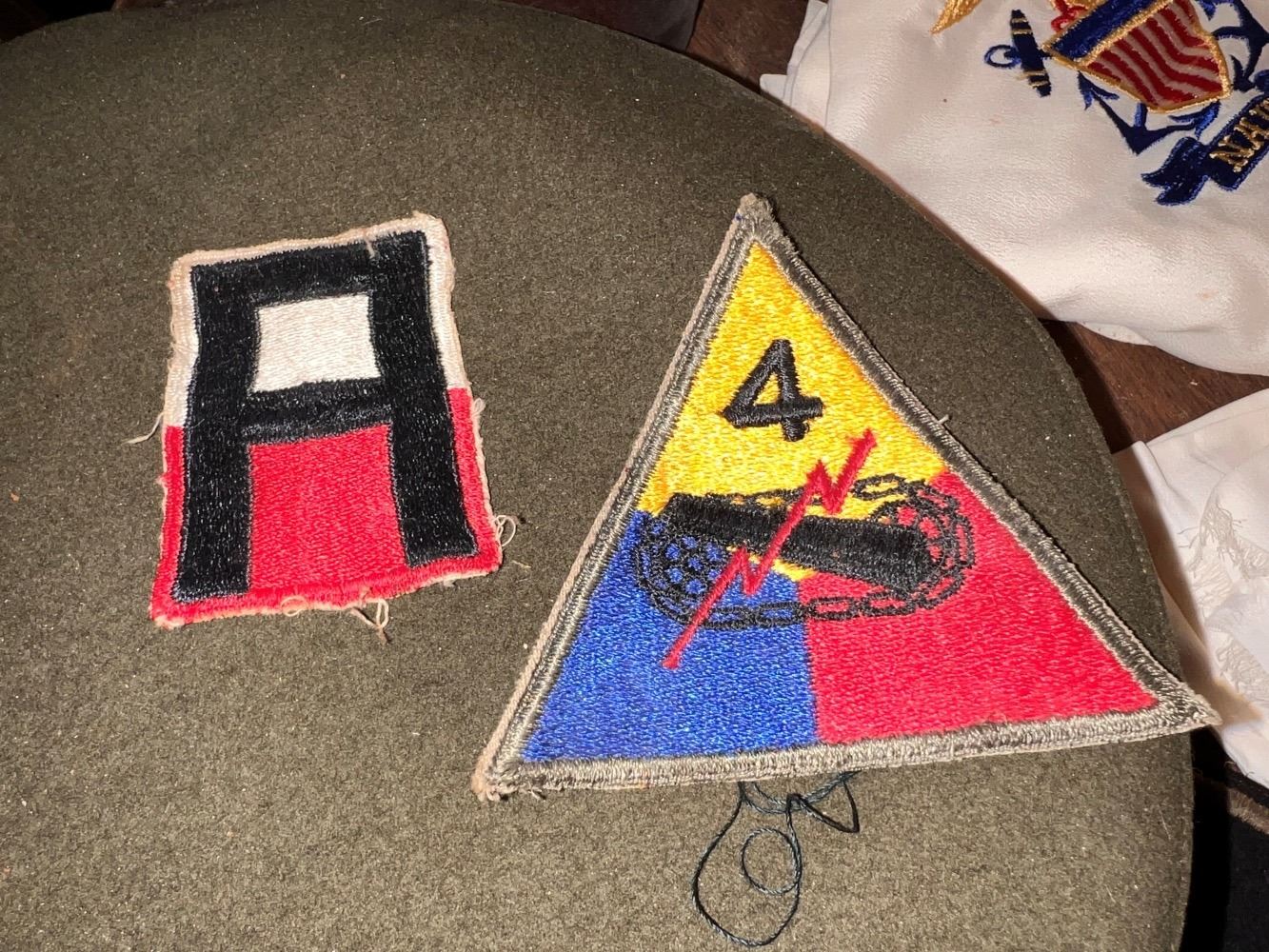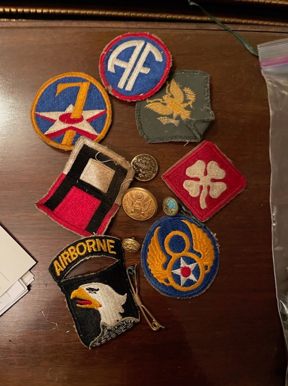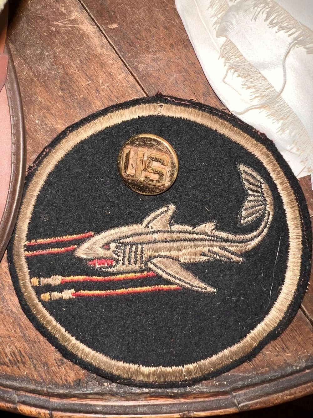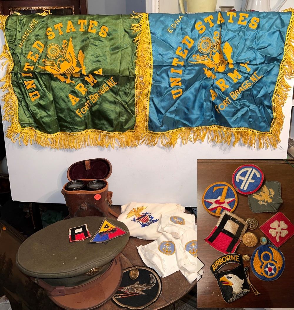 Army hat and patches and pin, 75th U.S Army Air Force Flying Tigers patch (Shark with missiles coming from it). Navy handkerchiefs, pillow covers and binoculars.