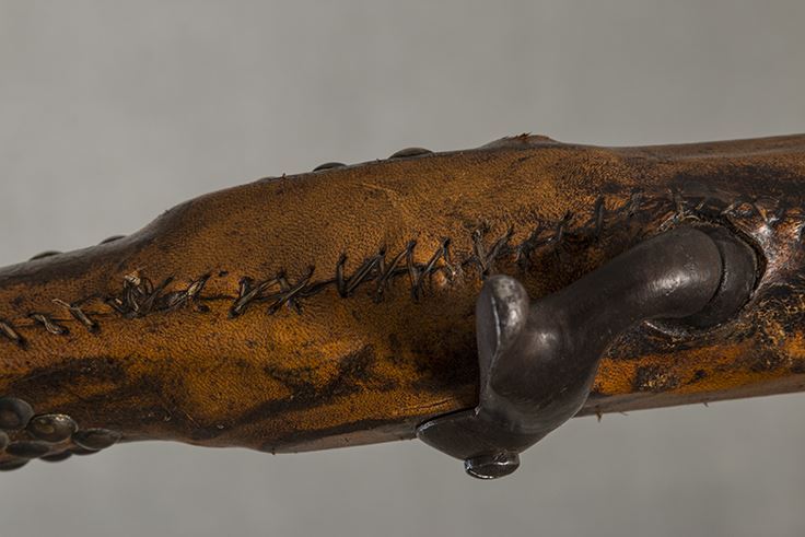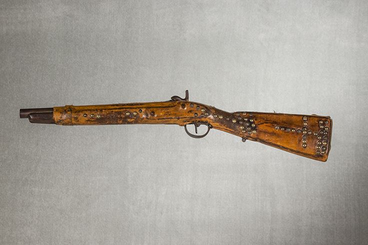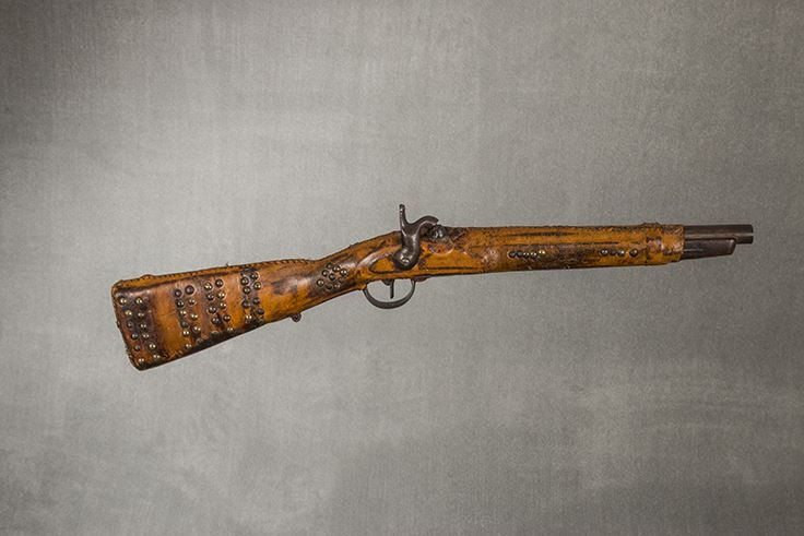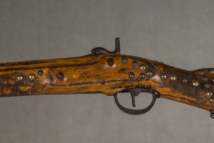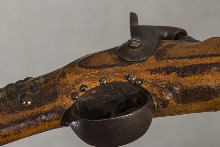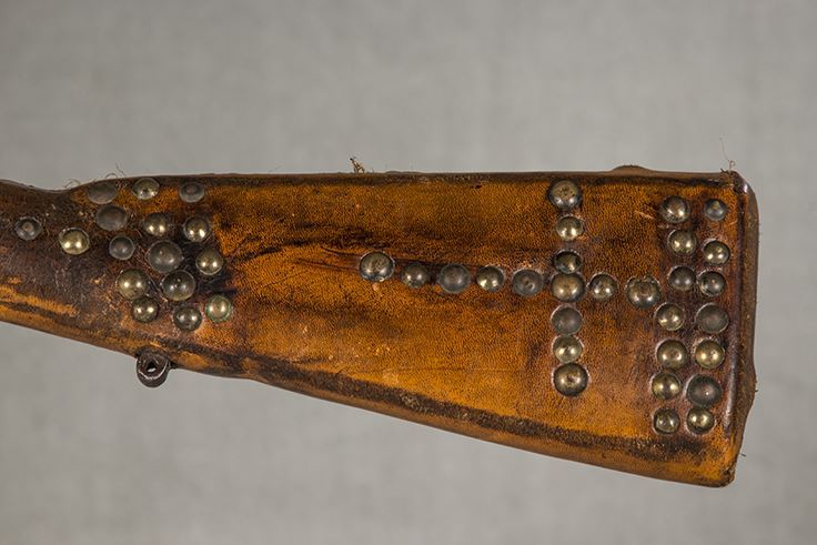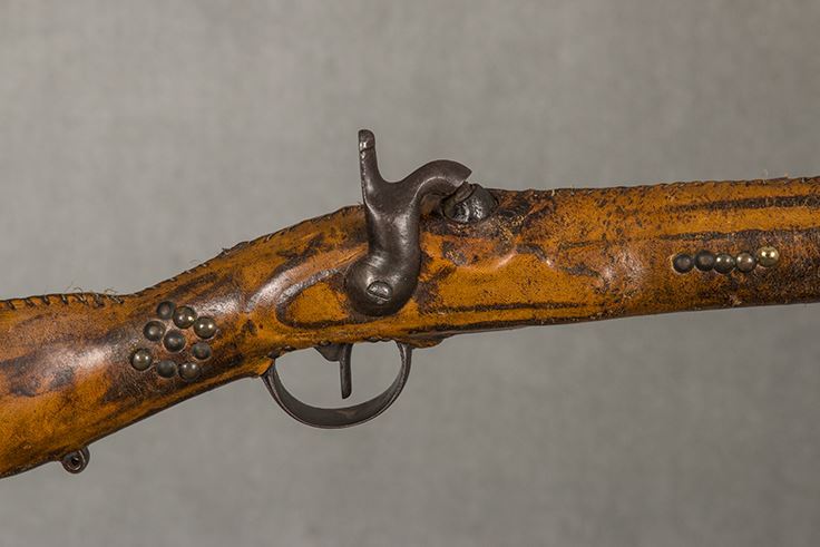 Military Musket. 30" long cut down for Indian use. Gun is covered in leather which is sinew sewn, then decorated with tacks. Very nice example of a blanket gun style weapon. Late 19th century.