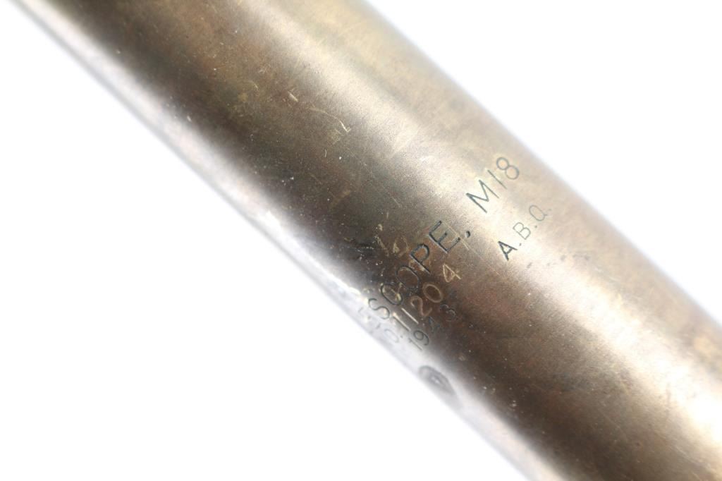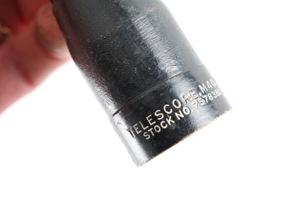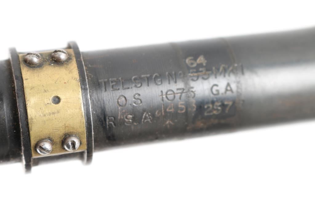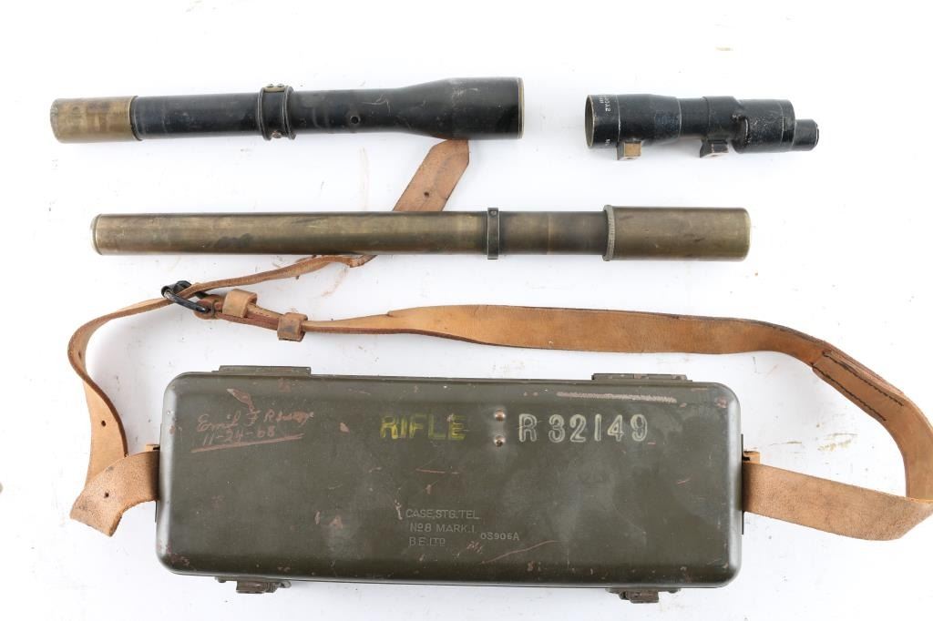 1) Telescope No 64 Mk I, upgraded from No 53, no mounts, in good condition externally, optical view is cloudy and dark. Marked "RSA" 2) Unknown brass bodied sight, with reticle marked "R" and "L" 3) metal scope case with strap, marked "CASE, STG TEL, No 8 Mk I", and "BE Ltd". Very good condition overall, strap has condition issues, marked with previous owner's name. 4) US M40A2 Telescope, used on WWII light tanks as a gun sight, in good condition.